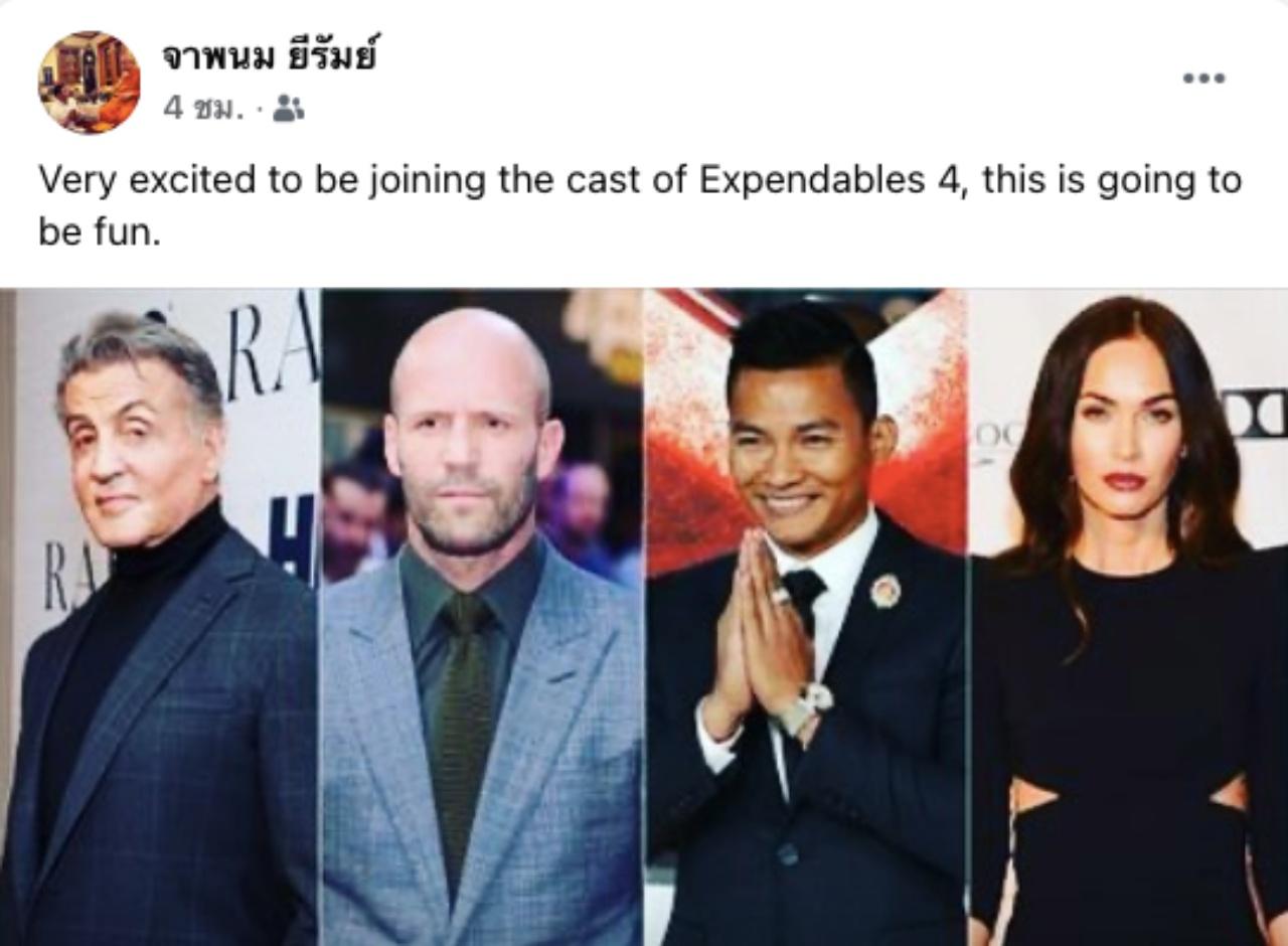 Very excited to be joining the cast of Expendables 4, this is going to be fun. ตื่นเต้นมากๆ ที่จะได้ร่วมเล่นในหนัง Expendables 4 นี่คือความสนุก