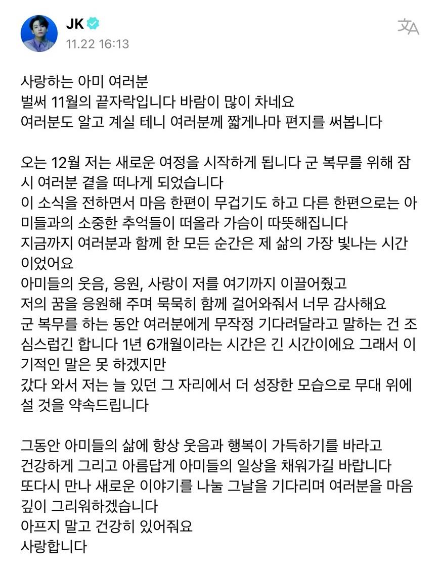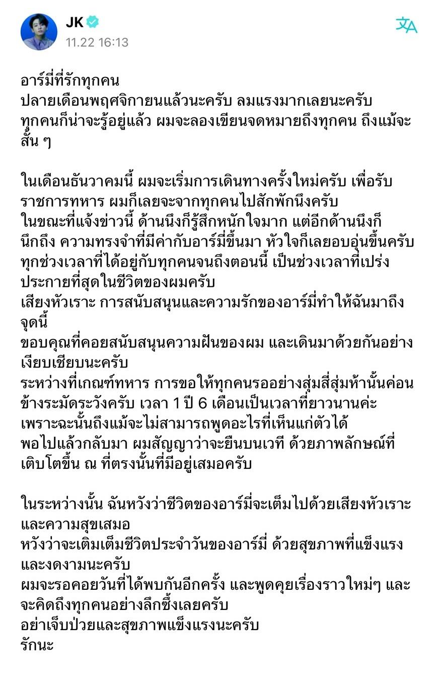 ล่าสุด จองกุก BTS ได้โพสต์ข้อความถึงอาร์มี่ (แฟนคลับวง BTS) ลงใน Weverse ถึงการเตรียมเข้ากรมรับราชการทหารในเดือน ธ.ค. 2566 โดยมีเนื้อหาดังนี้