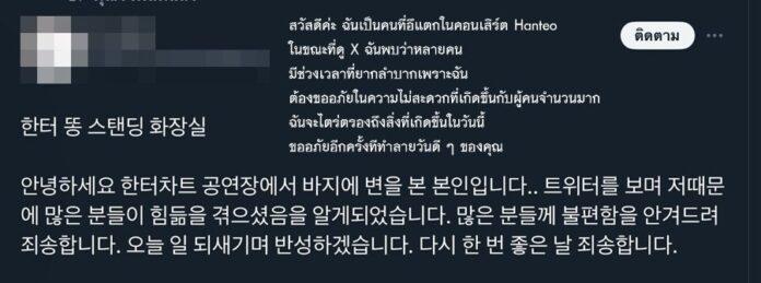 ซึ่งหลังจากที่เกิดเรื่องดังกล่าวก็มีผู้ใช้ทวิตเตอร์ (X) รายหนึ่งอ้างว่าตนคือคนที่เกิดอุจจาระราดกลางงาน โดยบอกว่าเหตุการณ์ดังกล่าวตนทำไปโดยไม่ตั้งใจ รู้สึกผิดมากที่ทำลายวันดีๆ ของทุกคน ก่อนบอกว่าพร้อมชดใช้ค่าเสียหายถ้าทำให้เสื้อผ้าของใครเปื้อน แต่ก็มีหลายคนตั้งข้อสังเกตว่าแฟนคลับรายนี้อาจจะตั้งใจ เพราะก่อนหน้าที่จะมีงาน 3 วันก็ได้โพสต์คำว่าอึด้วย.