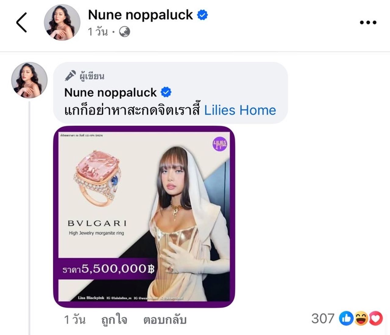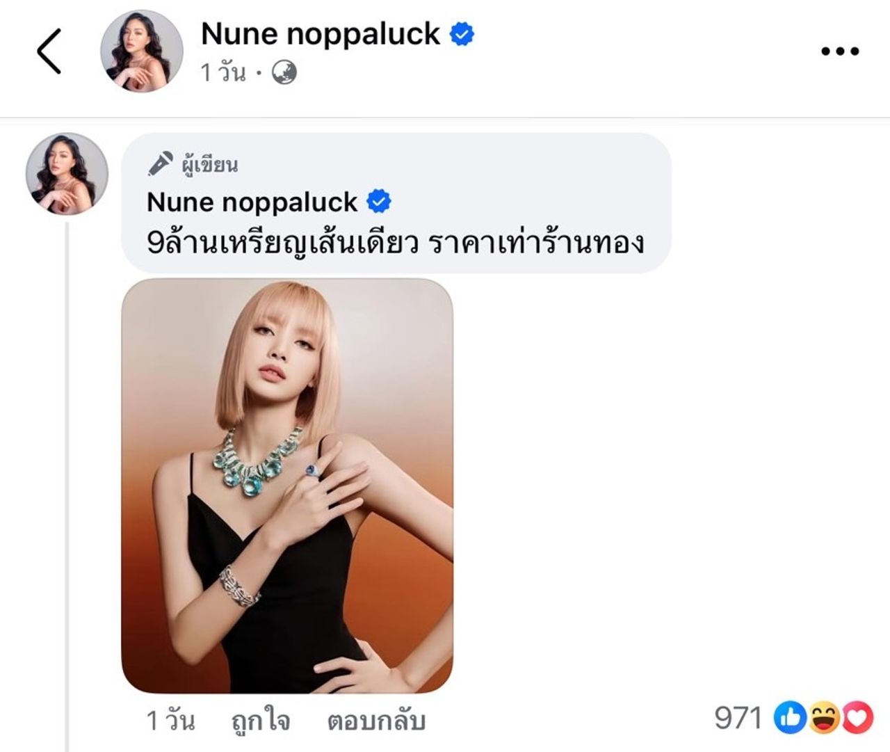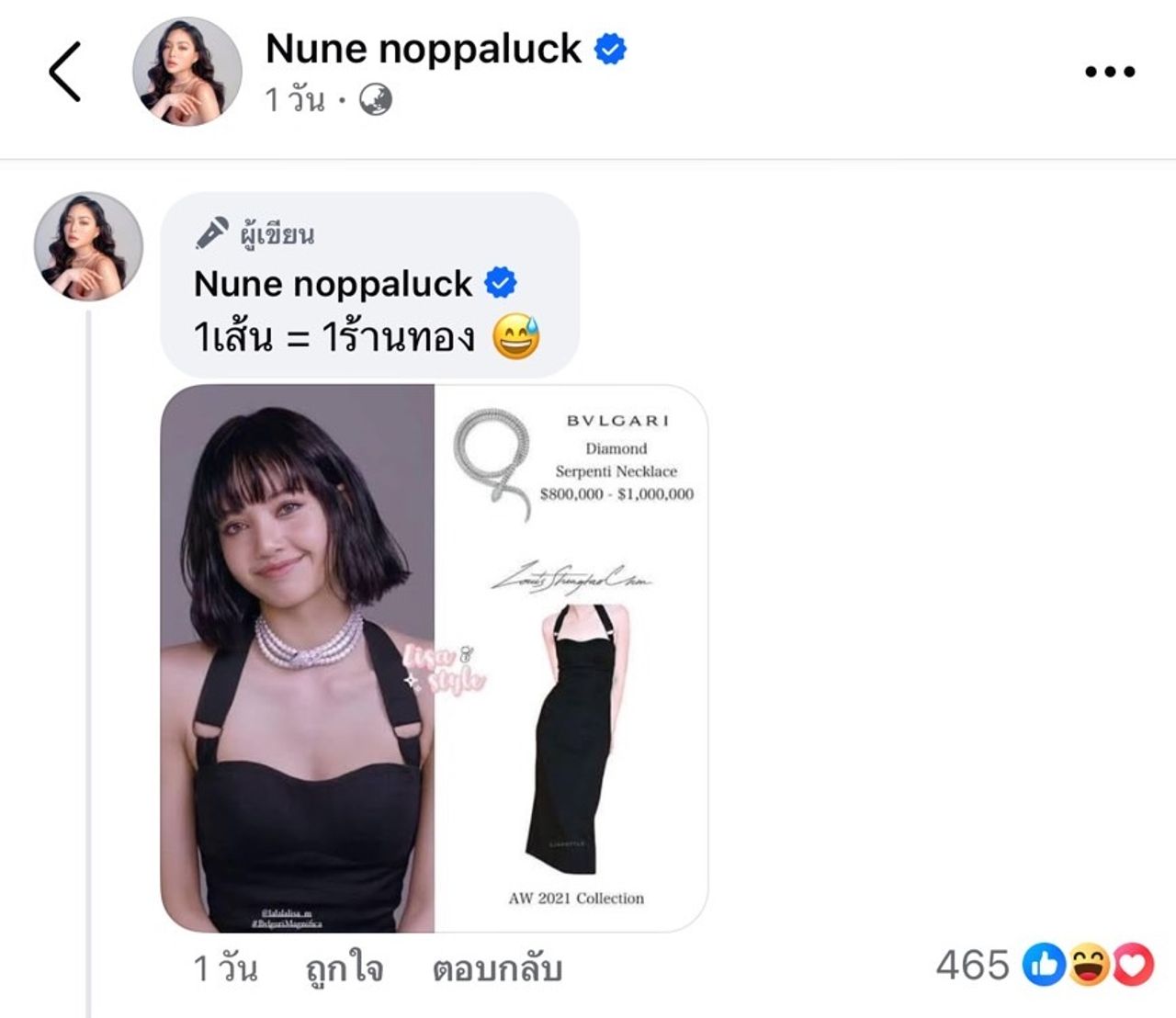 รวมไปถึง นุ่น นพลักษณ์ อินฟลูเอนเซอร์ชื่อดัง ซึ่งเป็นแฟนคลับลิซ่า ก็ได้โพสต์ภาพข้อความดังกล่าวและเขียนแคปชั่นว่า “โอ๊ยยยยย บูแกรี เส้นละ 50 ล้านนนน ต้องแขวนทองทั้งร้านบ่หน๊ออออออออออ 555555555555555555555” พร้อมทั้งคอมเมนต์รวบรวมภาพเครื่องประดับ รวมไปถึงรถหรู เสื้อผ้าต่างๆ ที่ ลิซ่า ใช้ ซึ่งแต่ละอย่างมีมูลค่านับล้านด้วย