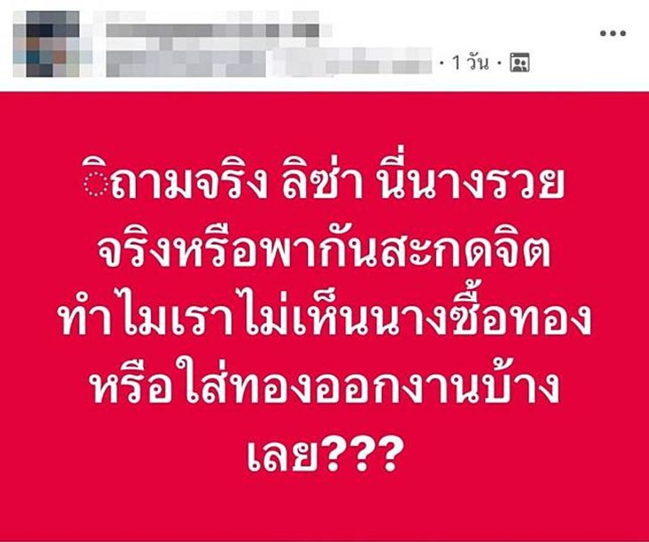 ล่าสุดมีผู้ใช้เฟซบุ๊กรายหนึ่งที่โพสต์ข้อความตั้งคำถามว่า “ถามจริง ลิซ่า นี่นางรวยจริงหรือพากันสะกดจิต ทำไมเราไม่เห็นนางซื้อทอง หรือใส่ทองออกงานบ้างเลย???”