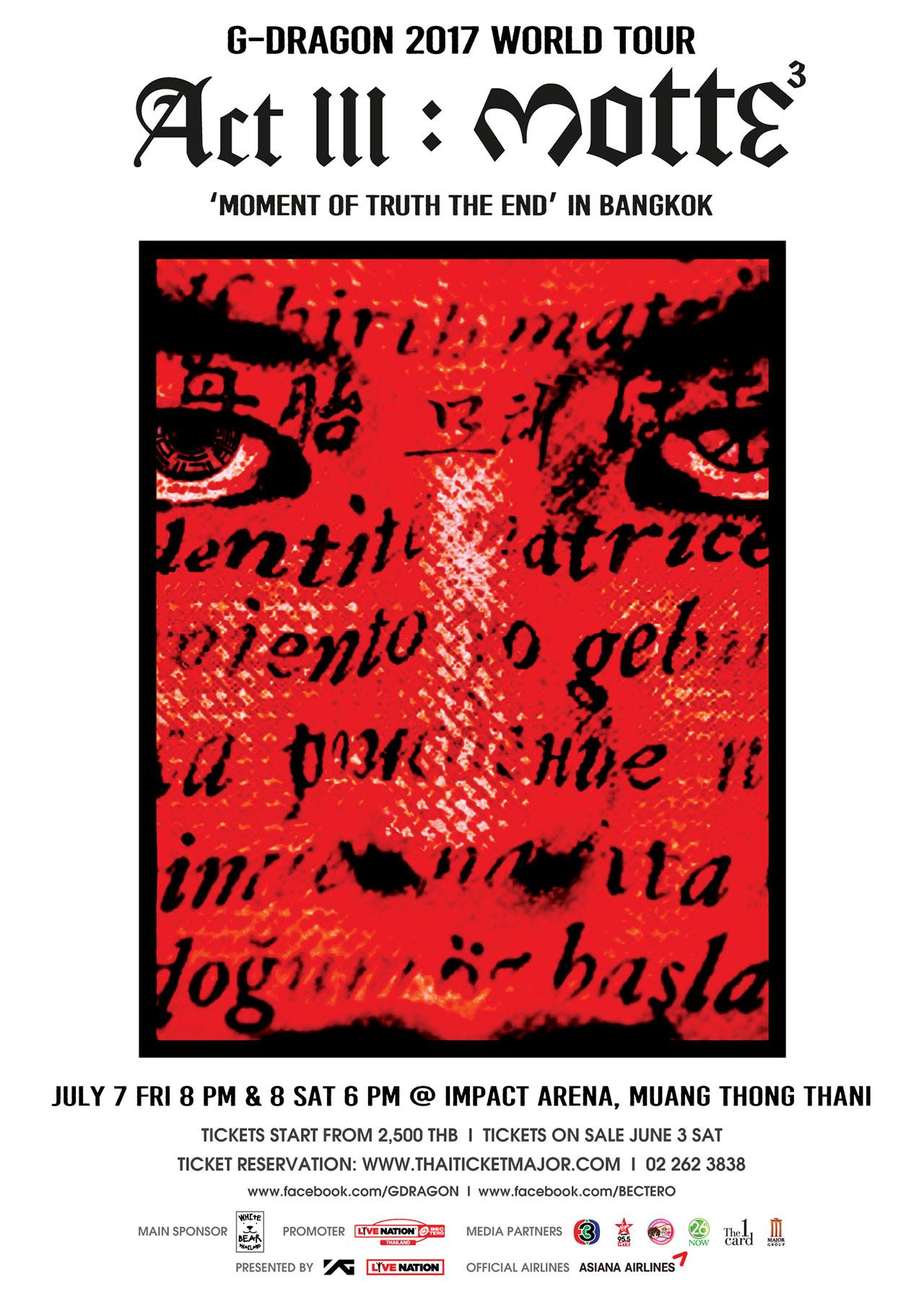 คอนเสิร์ต “จี-ดรากอน 2017 เวิลด์ ทัวร์ <แอคท์ 3, ม็อทเท>” (G-DRAGON 2017 WORLD TOUR <ACT III, M.O.T.T.E>) จะเปิดฉากทัวร์รอบแรกที่กรุงโซลในเดือนมิถุนายนนี้ ก่อนจะเดินทางไปเปิดการแสดงในอีกหลายประเทศทั่วโลก สำหรับการแสดงในประเทศไทยจะจัดขึ้นในวันที่ 7-8 กรกฎาคม 2560 ที่อิมแพ็ค อารีน่า เมืองทองธานี บัตรราคาเริ่มต้นที่ 2,500 บาท