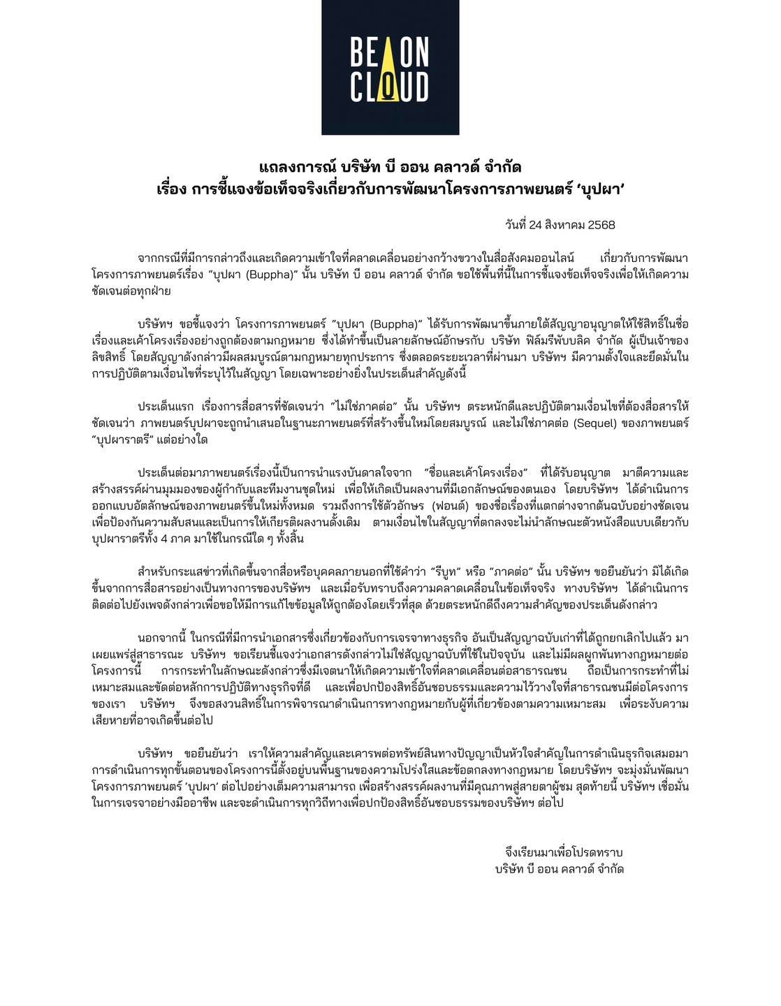“แถลงการณ์ บริษัท บี ออน คลาวด์ จํากัด เรื่อง การชี้แจงข้อเท็จจริงเกี่ยวกับการพัฒนาโครงการภาพยนตร์ 'บุปผา’