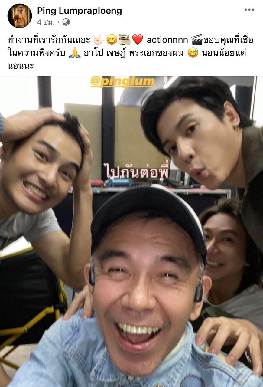 ก่อนจะโพสต์ภาพกับ อาโป ณัฐวิญญ์ และ เจษ เจษฎ์พิพัฒ และเขียนข้อความว่า “ทำงานที่เรารักกันเถอะ actionnnn ขอบคุณที่เชื่อในความพิงครับ อาโป เจษฎ์ พระเอกของผม นอนน้อยแต่นอนนะ”
