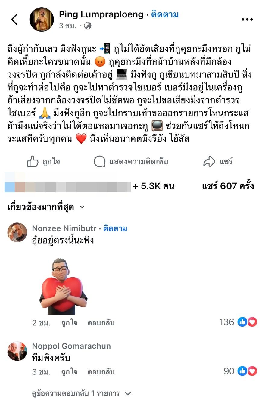 และพิง ลำพระเพลิง ก็ได้แคปโพสต์ดังกล่าวมาโพสต์ลงเฟซบุ๊กส่วนตัว และเขียนข้อความเดือดว่า “กูสาบานด้วยชีวิตกู ชีวิตเมียกู ชีวิตลูกกู ถ้ากูพูดสิ่งที่เห็นในโพสต์นี้ แม้แต่ค่าเดียว ให้กูตายห่xทั้งโคตร ใครก็ตามที่กุเรื่องนี้ขึ้นมา มึงกล้าไปวัดพระแก้วกับกู สาบานด้วยชีวิตลูกมึงที่เหลือมั้ย”