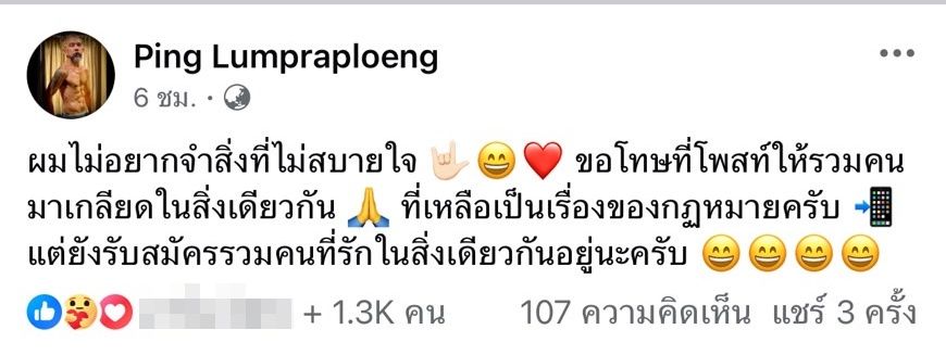 แต่หลังจากนั้น พิง ลำพระเพลิง ก็ได้ลบข้อความออกไป ก่อนจะโพสต์ข้อความใหม่ว่า “ผมไม่อยากจำสิ่งที่ไม่สบายใจ ขอโทษที่โพสต์ให้รวมคนมาเกลียดในสิ่งเดียวกัน ที่เหลือเป็นเรื่องของกฏหมายครับ แต่ยังรับสมัครรวมคนที่รักในสิ่งเดียวกันอยู่นะครับ”