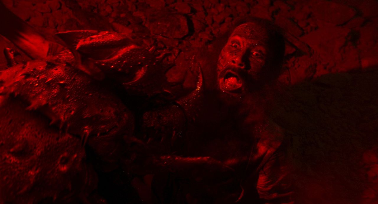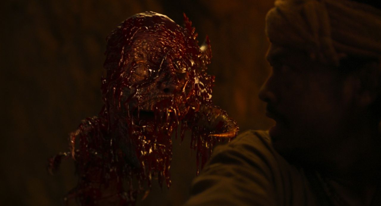 เต้ย-ชาลิต เผยว่า “โจทย์ของเรื่องนี้คือ เราจะทำยังไงให้คนกลัวสัตว์ประหลาดตัวนี้ จะออกแบบยังไงให้นักแสดงกลัวเวลาเข้าฉาก เรื่องนี้เราใช้เทคนิคซีจีผสมกับงาน Particle Effect เราจะมีม็อกอัพใช้เลือดจริงในฉากให้นักแสดงเห็นจริง ๆ ผมจะไม่ใช้ซีจีล้วน เราพยายามดีไซน์เทคนิคให้ตอบโจทย์หนังเรื่องนี้ เรื่องนี้เป็นเรื่องแรก ๆ ของไทยที่ใช้งานซีจีผสมผสานกับงานม็อกอัพครับ โอมุคาเดะเป็นเรื่องเล่าปีศาจปรัมปรา ๆ มันสามารถแฝงกายในร่างกายของมนุษย์ได้ด้วย เราก็ต้องตีโจทย์มอนสเตอร์ตัวนี้ให้มีเอกลักษณ์ ต้องเพิ่มรายละเอียดบางอย่างที่พิเศษเพื่อให้คนจดจำ โอมุคาเดะในเวอร์ชั่นนี้เป็นออริจินัล เหมือนเราจินตนาการว่าเอเลี่ยนหน้าตาแบบนี้นะ ผมก็ต้องไปศึกษาธรรมชาติของตะขาบผสมกับตำนาน และสิ่งมีชีวิตที่ใกล้เคียง วัฏจักรชีวิตเป็นยังไง ใช้ชีวิตอยู่ยังไงในถ้ำ”