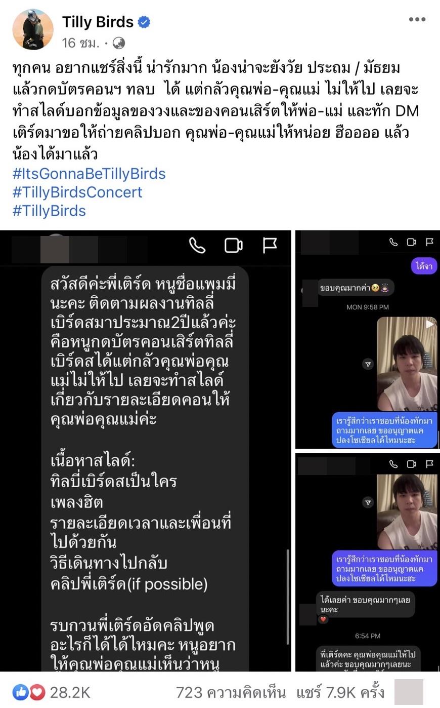 พร้อมทั้งเขียนข้อความว่า “ทุกคน อยากแชร์สิ่งนี้ น่ารักมาก น้องน่าจะยังวัย ประถม / มัธยม แล้วกดบัตรคอนฯ ทลบ ได้ แต่กลัวคุณพ่อ-คุณแม่ ไม่ให้ไป เลยจะทำสไลด์บอกข้อมูลของวงและของคอนเสิร์ตให้พ่อ-แม่ และทัก DM เติร์ดมาขอให้ถ่ายคลิปบอก คุณพ่อ-คุณแม่ให้หน่อย ฮืออออ แล้วน้องได้มาแล้ว #ItsGonnaBeTillyBirds #TillyBirdsConcert #TillyBirds”