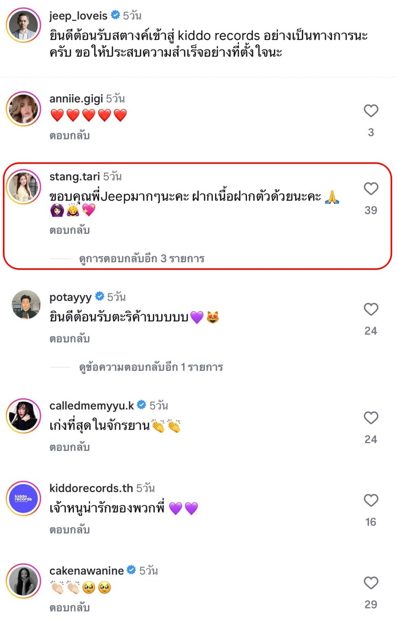 ซึ่ง สตางค์ ตริษา ก็ได้เข้ามาคอมเมนต์ว่า “ขอบคุณพี่ Jeep มากๆ นะคะ ฝากเนื้อฝากตัวด้วยนะคะ” อีกทั้งยังโพสต์ภาพลงในอินสตาแกรมส่วนตัว @stang.tari และเขียนข้อความว่า “ขอบคุณพี่ @jeep_loveis ที่เมตตาเเละให้โอกาสสตางค์มาอยู่ในค่ายนะคะ และขอบคุณพี่ @potayyy @peteperapols ที่ใจดีกับน้องนะคะ จะตั้งใจทำงานให้ดีที่สุดค่าา”.