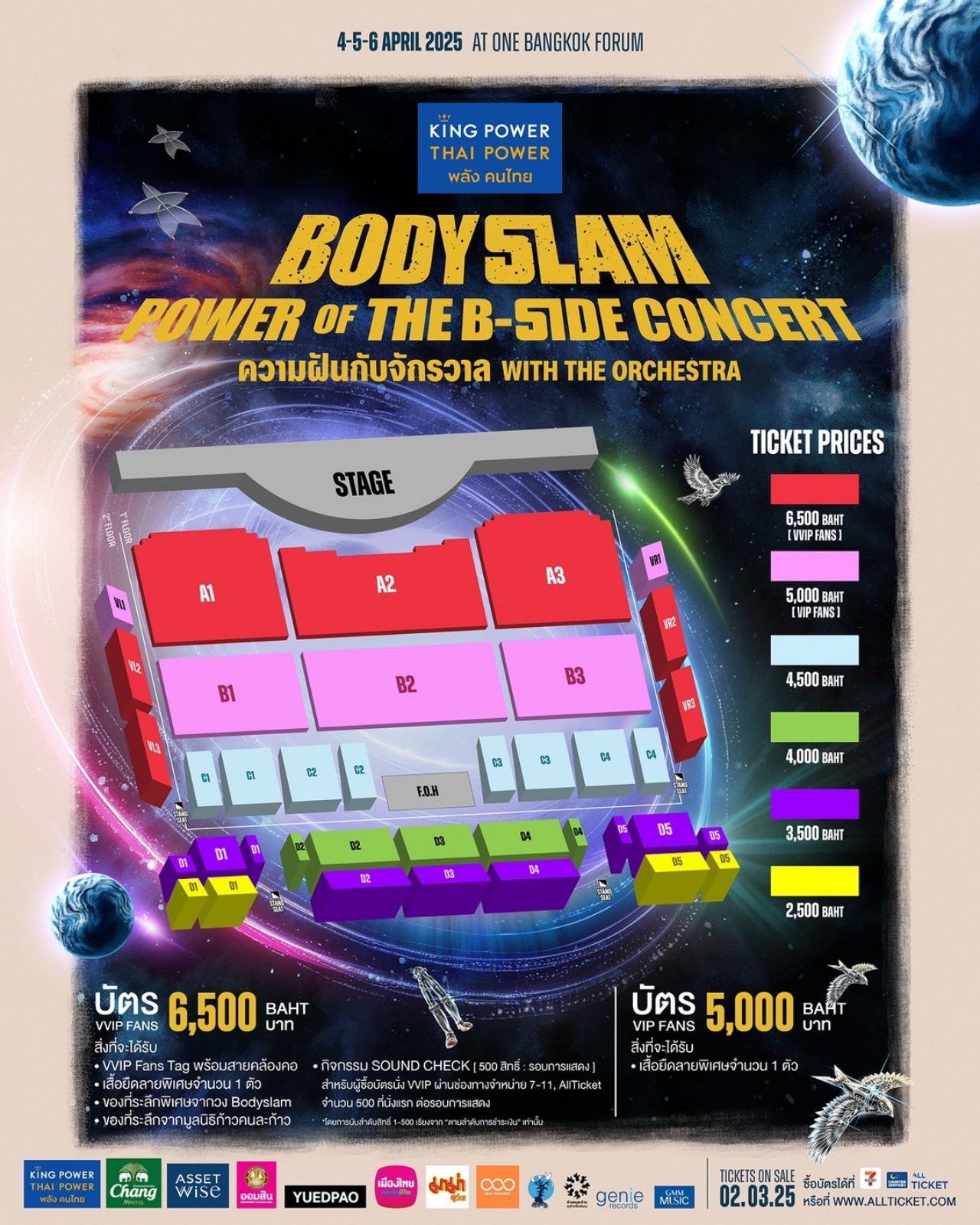 แฟนพันธุ์แท้ของบอดี้สแลมไม่ควรพลาด! ซื้อบัตรพร้อมกัน ในวันอาทิตย์ที่ 2 มีนาคม 2568 เวลา 10:00 น. บัตรเริ่มต้นที่ราคา 2,500 บาท และติดตามความเคลื่อนไหวพร้อมรายละเอียดเพิ่มเติมได้ที่เฟซบุ๊ก Bodyslam