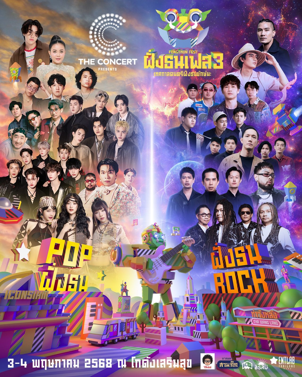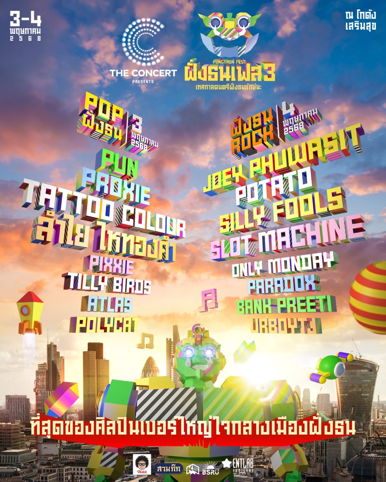 โดดสุดเหวี่ยงไปกับศิลปินเบอร์ใหญ่ใจกลางเมืองฝั่งธน จัดเต็มกับความ POP ในวันเสาร์ที่ 3 พฤษภาคม 2568 พบกับ PUN, PROXIE, PIXXIE, TILLY BIRDS, ลำไย ไหทองคำ, TATTOO COLOUR, ATLAS, POLYCAT สุดมันกับความ ROCK ในอาทิตย์ที่ 4 พฤษภาคม 2568 พบกับ โจอี้ ภูวศิษฐ์, SLOT MACHINE, ONLY MONDAY, POTATO, SILLY FOOLS, PARADOX, แบงค์ ปรีติ, URBOYTJ
