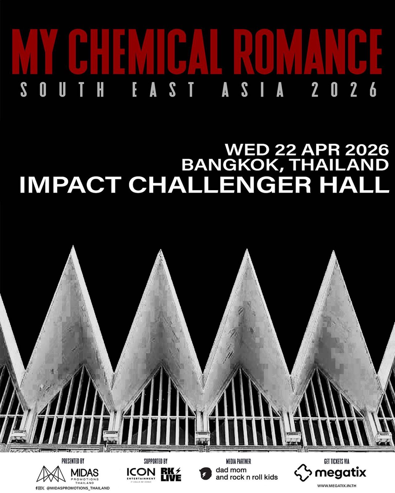 My Chemical Romance Live in Bangkok โดยผู้จัด Midas Promotions Thailand มีกำหนดรายละเอียดการเดินทางมาเล่นคอนเสิร์ตในประเทศไทย ดังนี้