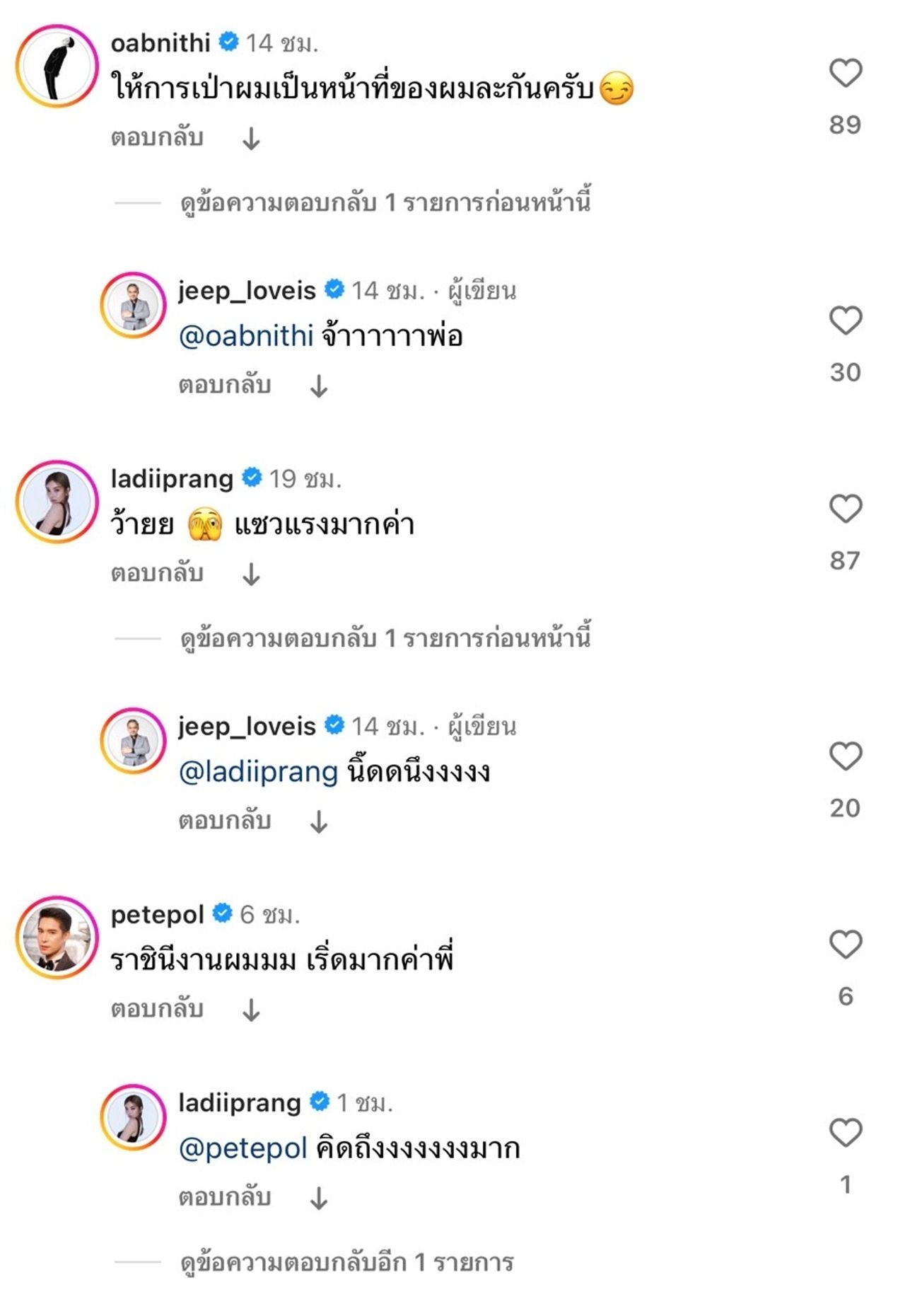 เจอแบบนี้ทำเอาเลดี้ปรางคอมเมนต์ตอบกลับว่า “ว้ายย แซวแรงมากค่า” และจี๊บก็ตอบกลับว่า “นิ๊ดดนึงงงงง” ในขณะที่ โอบ โอบนิธิ ก็รีบเข้ามาคอมเมนต์ว่า “ให้การเป่าผมเป็นหน้าที่ของผมละกันครับ” ก่อนที่จี๊บจะตอบกลับว่า “จ้าาาาาาพ่อ”