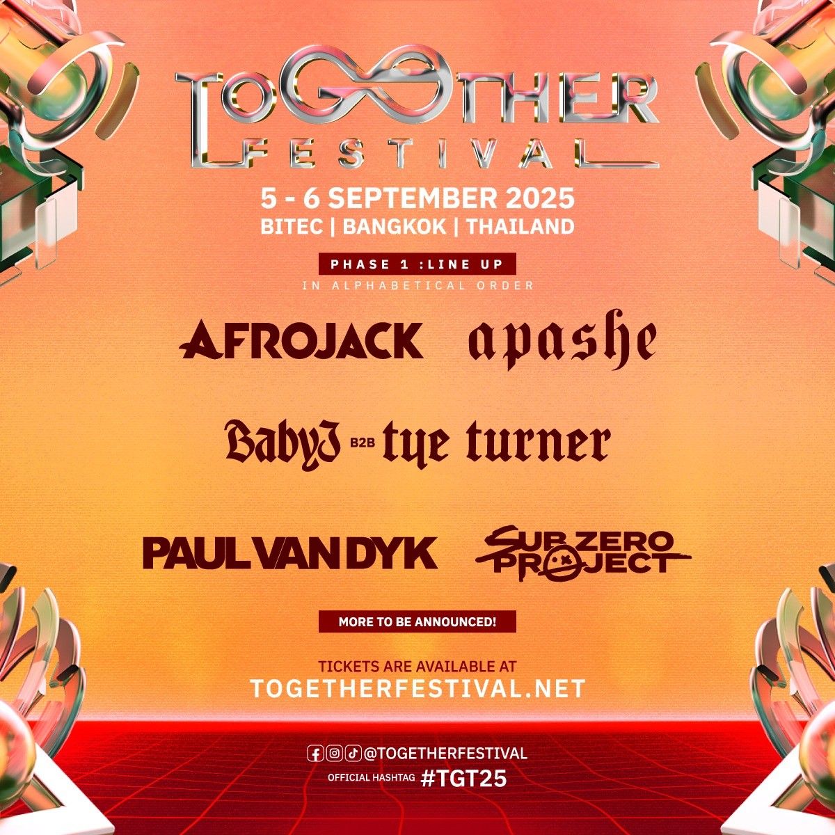 เตรียมพบกับทั้งตำนาน และคลื่นลูกใหม่แห่งวงการ EDM พร้อมโชว์ที่อัดแน่นทั้งเซ็ตลิสต์ขั้นเทพ เอฟเฟกต์สุดตื่นตา และหลากหลายสิ่งที่เกินความคาดหมายทุกสายตา และโสตประสาทในงาน Together Festival ในวันที่ 5-6 กันยายน นี้ ที่ไบเทค บางนา กรุงเทพฯ ใครที่อยากเป็นส่วนหนึ่งของตำนานบทใหม่ของเทศกาล EDM สัญชาติไทย สามารถซื้อบัตรได้แล้วที่ เว็บไซต์ togetherfestival