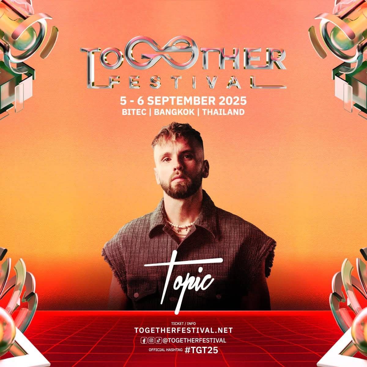 มาต่อกันที่ TOPIC ดีเจและโปรดิวเซอร์เชื้อสายเยอรมัน-โครเอเชีย ที่มาเยือนงาน Together Festival เป็นครั้งแรก โดยเขาสร้างชื่อจากผลงานเพลงสไตล์ “Melancholic Dance Music” หรือแนวเพลงที่แฝงไปด้วยอารมณ์ลึกซึ้ง รวมถึงเพลง I Adore You, Your Love (9PM) และ ...Breaking Me ที่มียอดฟังรวมกันนับพันล้านสตรีม