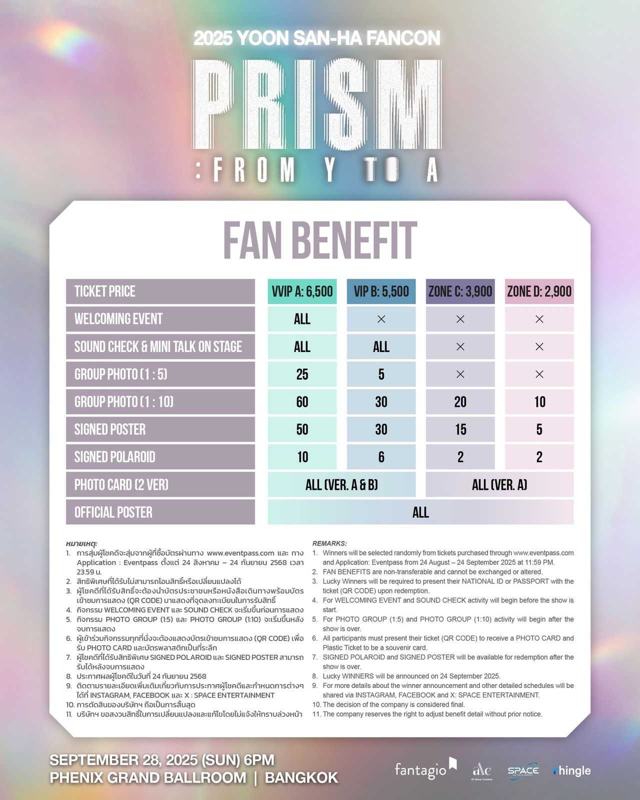 นอกจากจะได้ฟังเพลงสุดฮิตจากยุนซานฮาแล้ว เขายังเตรียมมอบประสบการณ์แบบใกล้ชิดที่แฟนๆ จะได้เห็นทุกมุมของยุนซานฮา ตั้งแต่เสน่ห์แบบขี้เล่นอบอุ่นไปจนถึงลุคเข้มเท่ เต็มไปด้วยโชว์พิเศษและเซอร์ไพรส์ที่เตรียมมาเพื่อประเทศไทยโดยเฉพาะ ผู้ถือบัตรจะมีโอกาสได้รับสิทธิพิเศษที่แฟนคลับทั่วโลกใฝ่ฝัน อาทิ การทักทายก่อนเข้างาน (Welcoming Event) ถ่ายรูปกลุ่มใหญ่ (Group Photo) โปสเตอร์ลายเซ็นจริง และโพลารอยด์ลายเซ็น ที่สงวนสิทธิ์ให้เฉพาะผู้เข้าร่วมงานเท่านั้น