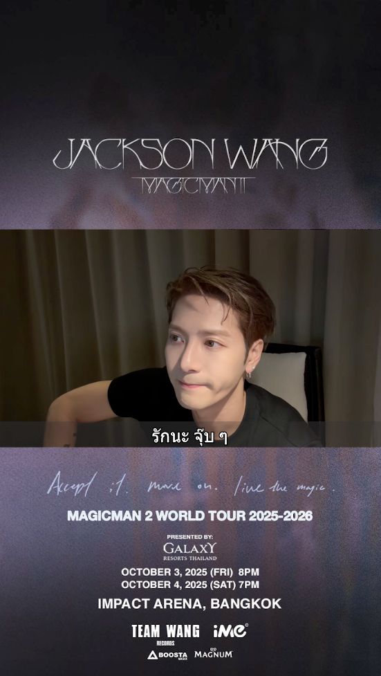 เรียกว่าทุกแพลตฟอร์มโดนยึดพื้นที่ไปด้วย MAGICMAN! และกลายเป็นวาระแห่งด้อมทันทีที่ศิลปินระดับโลก “แจ็คสัน หวัง” (JACKSON WANG) ประกาศเปิดเวิลด์ทัวร์ใหม่ โดยเลือกประเทศไทยเป็นจุดสตาร์ทที่แรก! งาน “MAGICMAN 2 WORLD TOUR 2025-2026 in Bangkok Presented by Galaxy Resorts Thailand” กับ 2 รอบการแสดงสุดยิ่งใหญ่กว่าครั้งก่อน ในวันศุกร์ที่ 3 ตุลาคม 2568 เวลา 20:00 น. และวันเสาร์ที่ 4 ตุลาคม 2568 เวลา 19:00 น. ณ อิมแพ็ค อารีน่า เมืองทองธานี โดยผู้จัด iMe Thailand พร้อมทุ่มไม่อั้นเพื่อความอลังการทุกโชว์