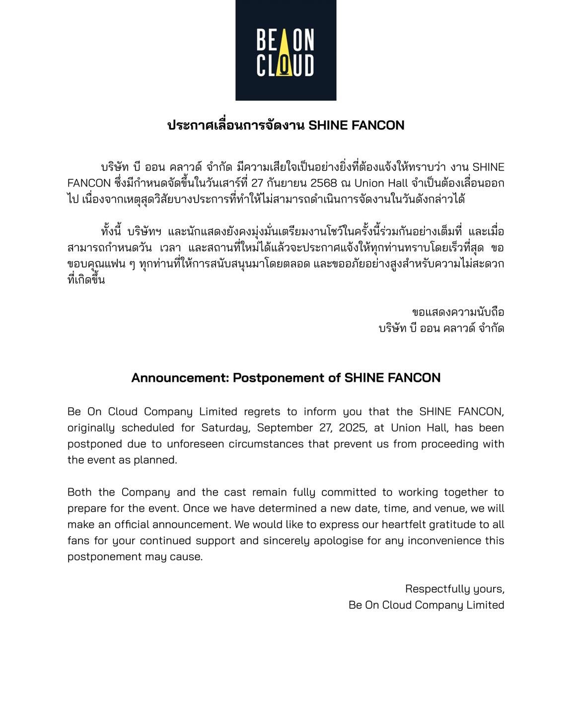 ทั้งนี้ บริษัทฯ และนักแสดงยังคงมุ่งมั่นเตรียมงานโชว์ในครั้งนี้ร่วมกันอย่างเต็มที่ และเมื่อสามารถกำหนดวัน เวลา และสถานที่ใหม่ได้แล้วจะประกาศแจ้งให้ทุกท่านทราบโดยเร็วที่สุด ขอขอบคุณแฟน ๆ ทุกท่านที่ให้การสนับสนุนมาโดยตลอด และขออภัยอย่างสูงสำหรับความไม่สะดวกที่เกิดขึ้น