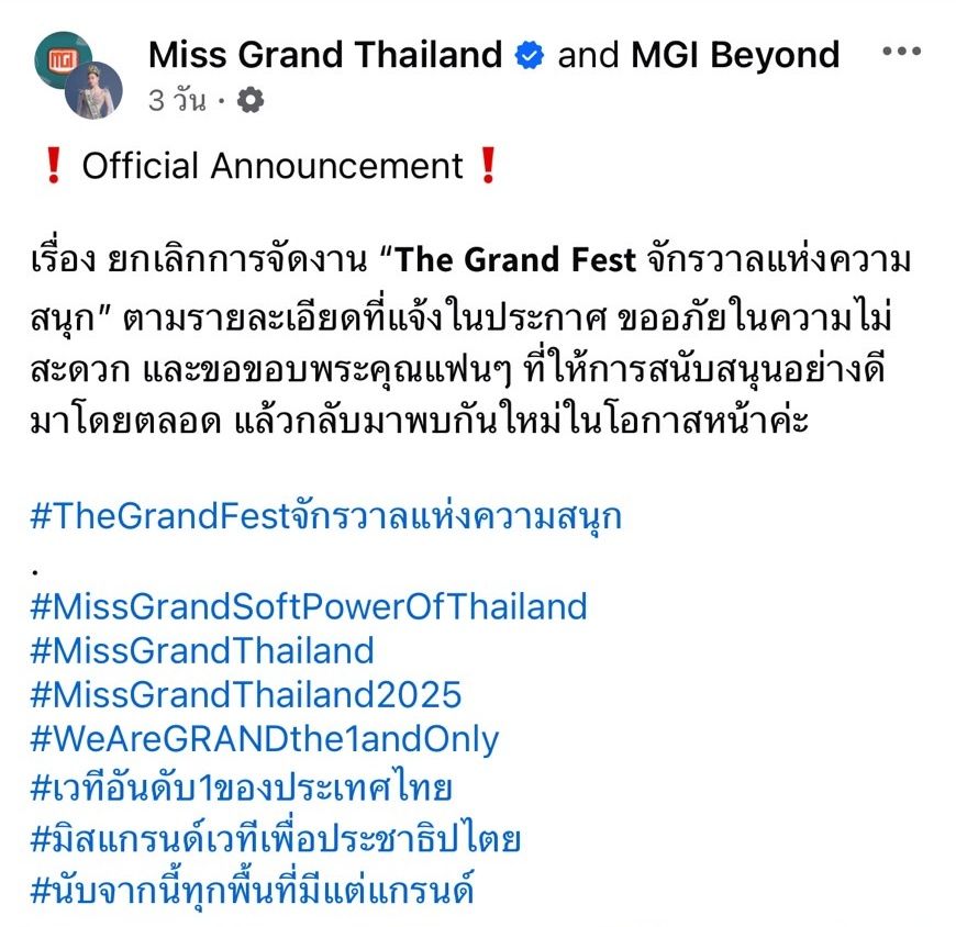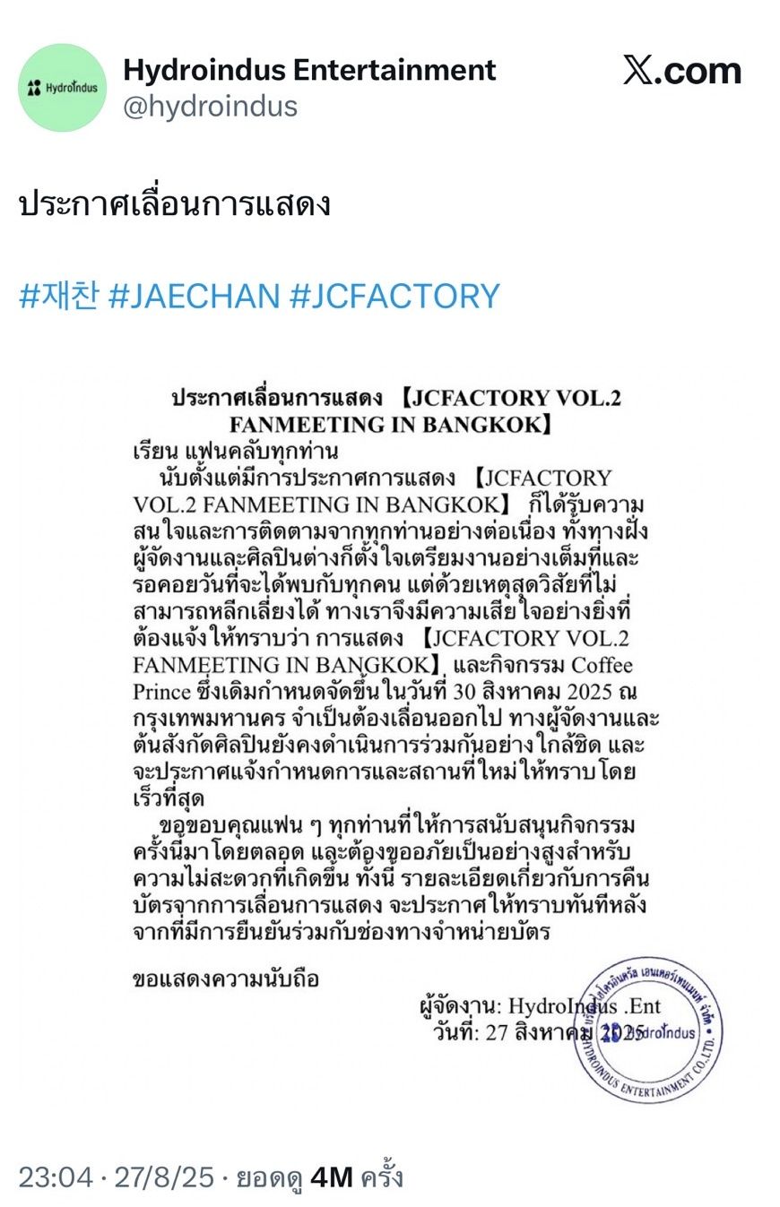 และเมื่อวันที่ 27 สิงหาคมที่ผ่านมา ทาง Hydroindus Entertainment ได้ออกประกาศผ่าน X เลื่อนการจัดงานแฟนมีทติ้งของศิลปินและนักแสดงเกาหลีชื่อดัง "พัคแจชาน (Park Jae Chan)" ที่กำลังจะมีแฟนมีตติ้งในงาน [JCFACTORY VOL.2 FANMEETING IN BANGKOK] ซึ่งเดิมกำหนดจัดขึ้นในวันเสาร์ที่ 30 สิงหาคม 2025 ณ Thai Summit Tower แต่จำเป็นต้องเลื่อนออกไป