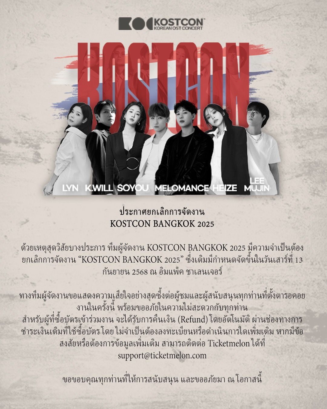 งาน KOSTCON BANGKOK 2025 ซึ่งเป็นงานคอนเสิร์ตของศิลปินเกาหลี ซึ่งเดิมมีกำหนดจัดขึ้นในวันเสาร์ที่ 13 กันยายน 2568 ณ อิมแพ็ค ชาเลนเจอร์