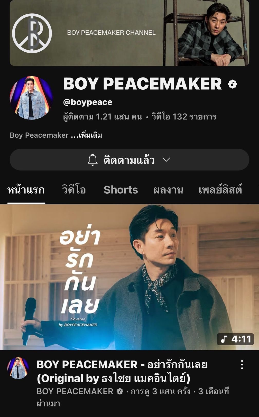 ใครที่คิดถึงบทเพลงในความทรงจำของ บอย Peacemaker กดติดตามช่อง YouTube BOY PEACEMAKER รอไว้ได้เลย ใครที่อยากฟังเพลงไหนลองคอมเมนต์ไว้ในช่องได้เลย เพลงที่คุณชอบอาจจะกลายเป็น Live Session ที่คุณคาดไม่ถึง!