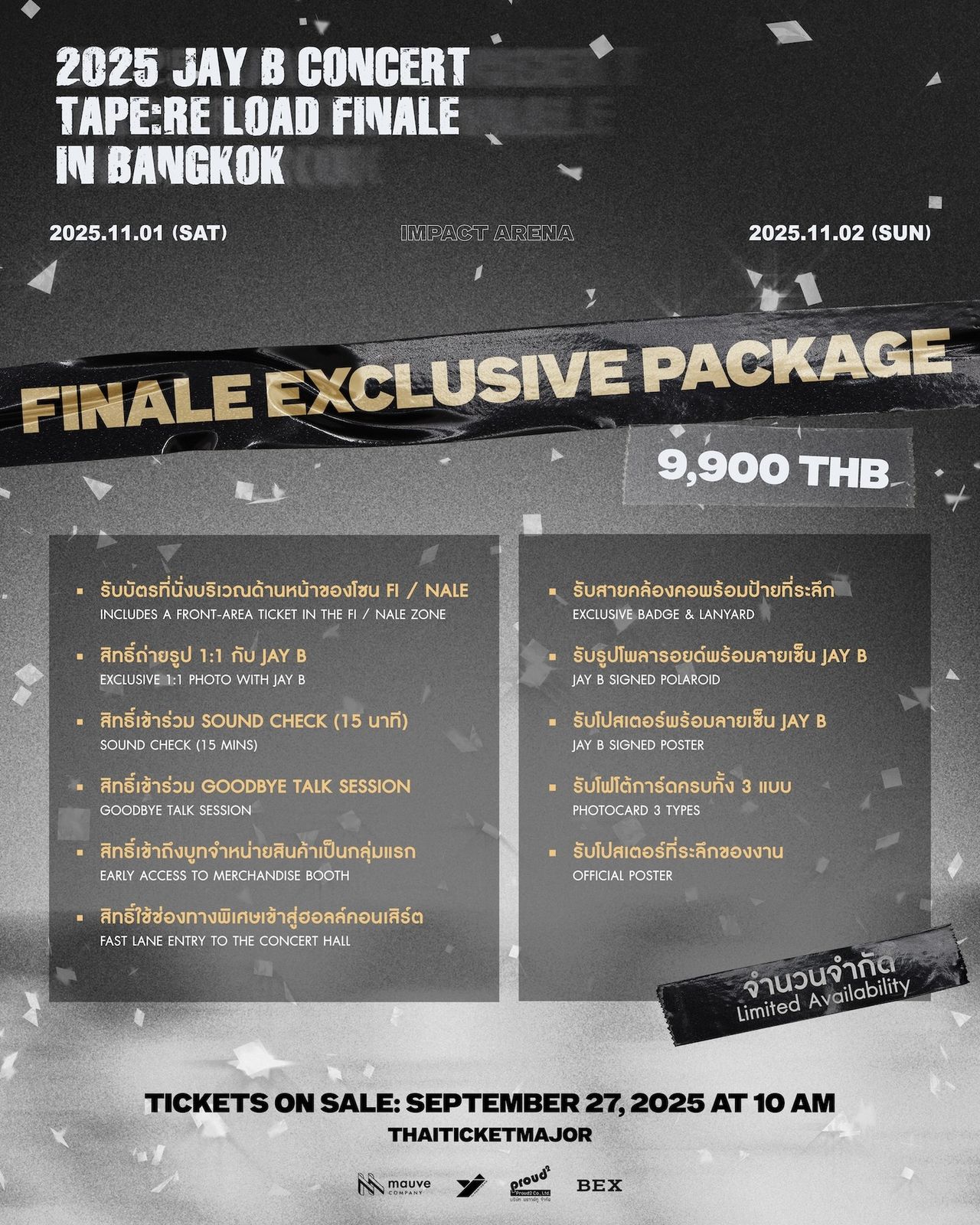 “สวัสดีครับทุกคน JAY B GOT7 นะครับ ทุกคนสบายดีกันไหมครับ หลังจากที่ได้จัดคอนเสิร์ตเมื่อเดือนมกราคมที่ผ่านมา ผมได้เตรียมคอนเสิร์ตครั้งนี้ขึ้นมาอีกครั้ง เพื่อที่จะได้มาสร้างความทรงจำดี ๆ ร่วมกับทุกคน นั่นก็คือ 2025 JAY B CONCERT [TAPE:RE LOAD FINALE] IN BANGKOK ครับ ถ้าอย่างนั้นอากาเซ่ทุกคนครับ มาเจอกันวันที่ 1 และ 2 พฤศจิกายน 2568 ที่ IMPACT ARENA นะครับ บ๊ายบาย ขอบคุณครับ”