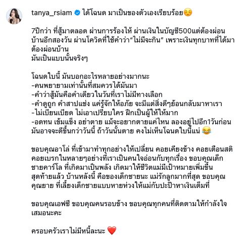 ขอบคุณอาโล่ ที่เข้ามาทำทุกอย่างให้เปลี่ยน คอยเคียงข้าง คอยเตือนสติ คอยเบรกในหลายๆอย่างที่เราเป็นคนใจอ่อนกับทุกเรื่อง ขอบคุณเด็กชายคาร์โล ที่เกิดมาเป็นพลัง เกิดมาให้ชีวิตแม่มีเป้าหมายเพิ่มขึ้น สุดท้ายแล้ว บ้านหลังนี้ คือของเด็กชายนะ แม่รักลูกมากที่สุด ขอบคุณคุณยาย ที่เลี้ยงเด็กชายแบบหายห่วงให้แม่กับปะป๊าหาเงินเต็มที่ ขอบคุณเอฟซี ขอบคุณคนรอบข้าง ขอบคุณทุกคนที่ติดตามให้กำลังใจเสมอนะคะ ครอบครัวเราไม่มีหนี้ละนะ