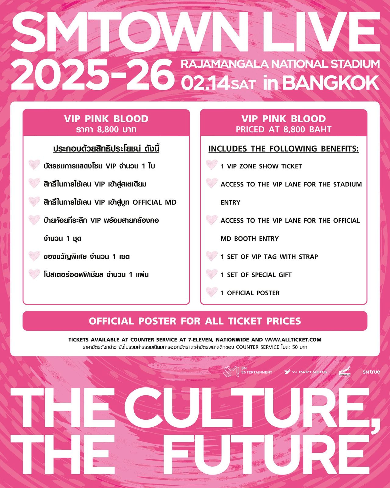 ในฐานะเมืองปิดท้ายทัวร์ที่ประเทศไทย ‘SMTOWN LIVE 2025-26 [THE CULTURE, THE FUTURE] in BANGKOK’ จะปลุกพลังและจิตวิญญาณที่หยั่งรากลึกในหัวใจของ PINK BLOOD (พิงค์บลัด : ชื่อเรียกผู้ที่รักในศิลปินและคอนเทนต์ของ SM) ให้กลับมาลุกโชนอีกครั้ง ด้วยพลังจากบทเพลงและการแสดงของศิลปินค่าย SM ที่คุณรัก สำหรับคอนเสิร์ตที่จะเกิดขึ้นในวันแห่งความรักนี้