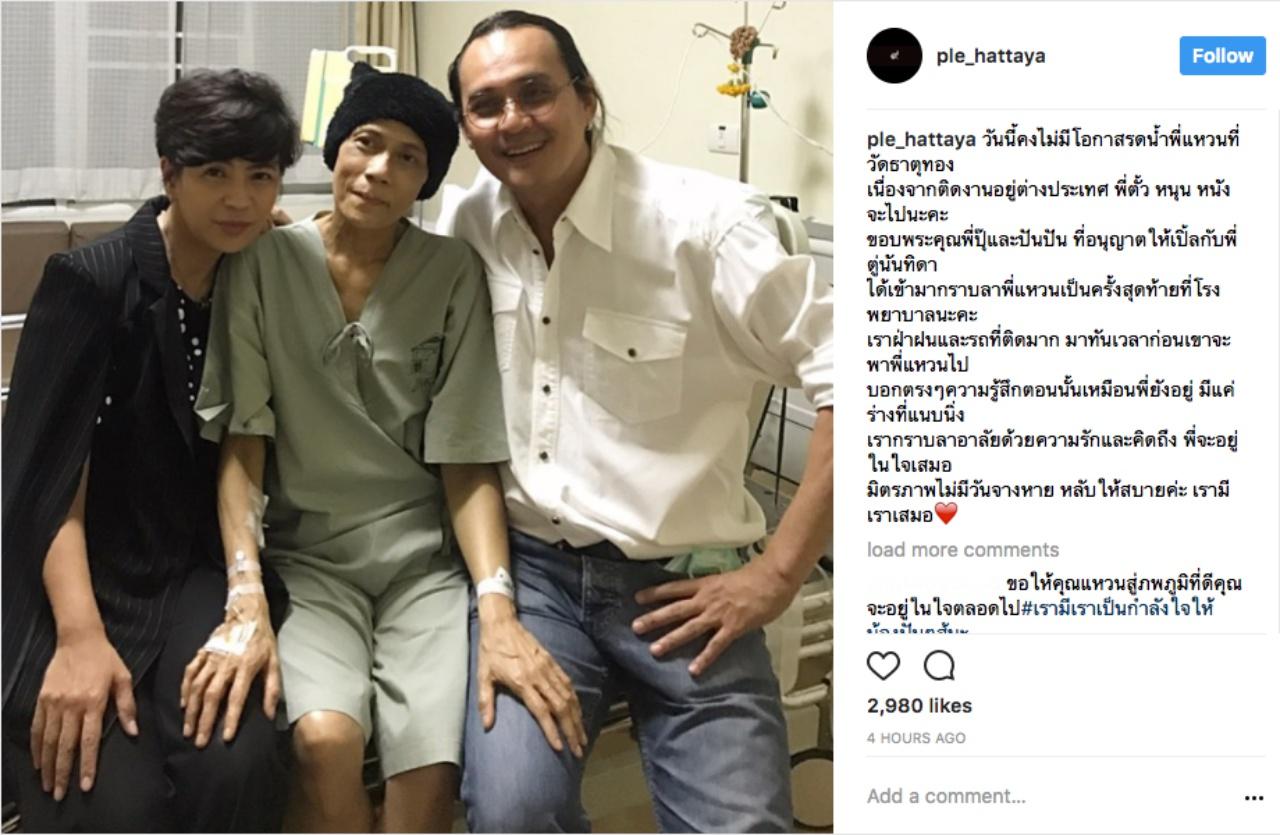 “วันนี้คงไม่มีโอกาสรดน้ำพี่แหวนที่วัดธาตุทอง เนื่องจากติดงานอยู่ต่างประเทศ พี่ตั้ว หนุน หนัง จะไปนะคะ ขอบพระคุณพี่ปุ๊และปันปัน ที่อนุญาตให้เปิ้ลกับพี่ตู่นันทิดา ได้เข้ามากราบลาพี่แหวนเป็นครั้งสุดท้ายที่โรงพยาบาลนะคะ