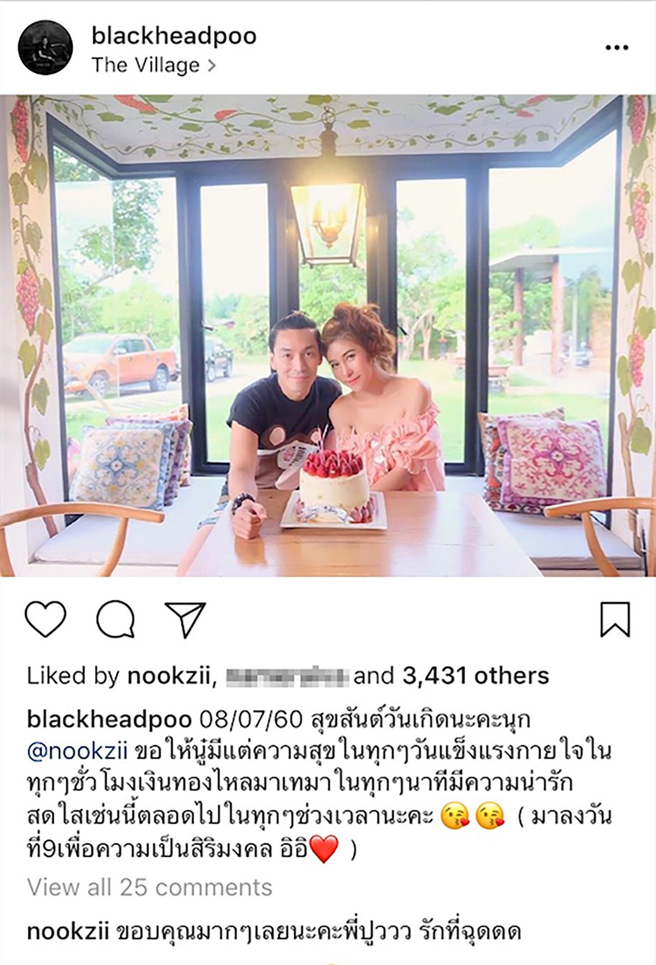 ทางด้านนักร้องหนุ่ม ปู แบล็คเฮด ก็ไม่พลาดที่จะอวยพรวันเกิดให้แฟนสาวเช่นกัน โดยโพสต์รูปและข้อความว่า “08/07/60 สุขสันต์วันเกิดนะคะนุก @nookzii ขอให้นู๋มีแต่ความสุขในทุกๆวันแข็งแรงกายใจในทุกๆชั่วโมงเงินทองไหลมาเทมาในทุกๆนาทีมีความน่ารักสดใสเช่นนี้ตลอดไปในทุกๆ ช่วงเวลานะคะ (มาลงวันที่ 9 เพื่อความเป็นสิริมงคล อิอิ)”