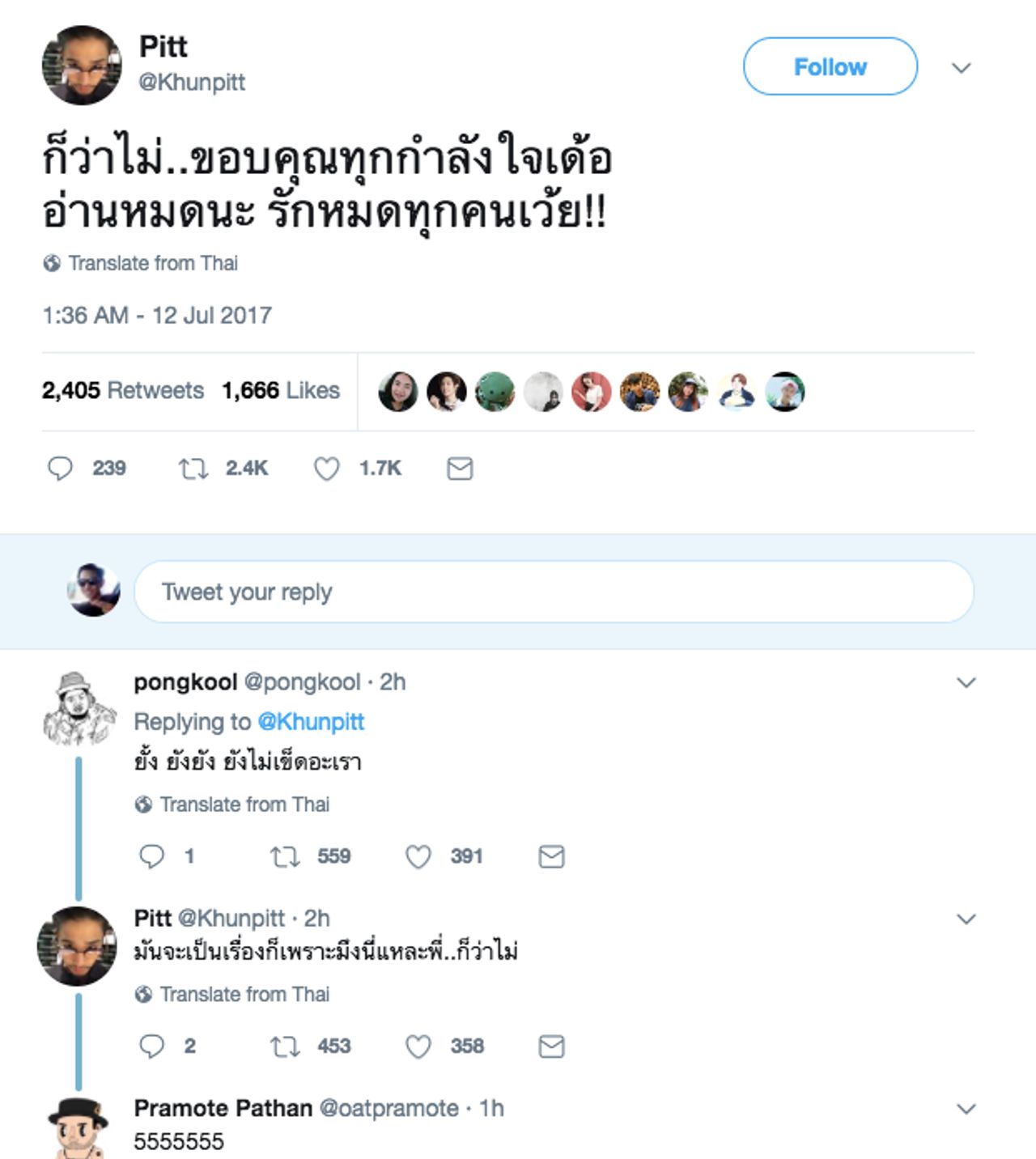 ล่าสุด พิชญ์ได้ออกมาโพสต์อีกครั้งโดยบอกว่า ก็ว่าไม่..ขอบคุณทุกกำลังใจเด้อ อ่านหมดนะ รักหมดทุกคนเว้ย!! โดยมี ป๊อบ ปองกูล เพื่อนสนิทมาคอมเมนต์ว่า "ยัง ยังไม่เข็ดอ่ะเรา "
