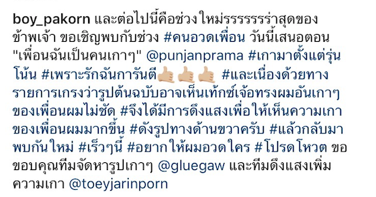 และหลังจากที่หนุ่มปั้นจั่นโดนบอยแกล้ง ก็ได้นำรูปดังกล่าวมาลงในอินสตาแกรมของตัวเอง พร้อมแคปชั่นว่า “ผมจะไม่หนีผมจะสู้ด้วยความจริง อดีตอันสับสนของผมช่วงเกาหลียุคแรกที่ระบาดมาถึงเด็กไทย ความมั่นใจเลยยังไม่เข้าที่ และจะไม่มีใครมาเอารูปนี้มาล้อข้าได้อีก @boy_pakorn @toeyjarinporn ข้าลงเอง