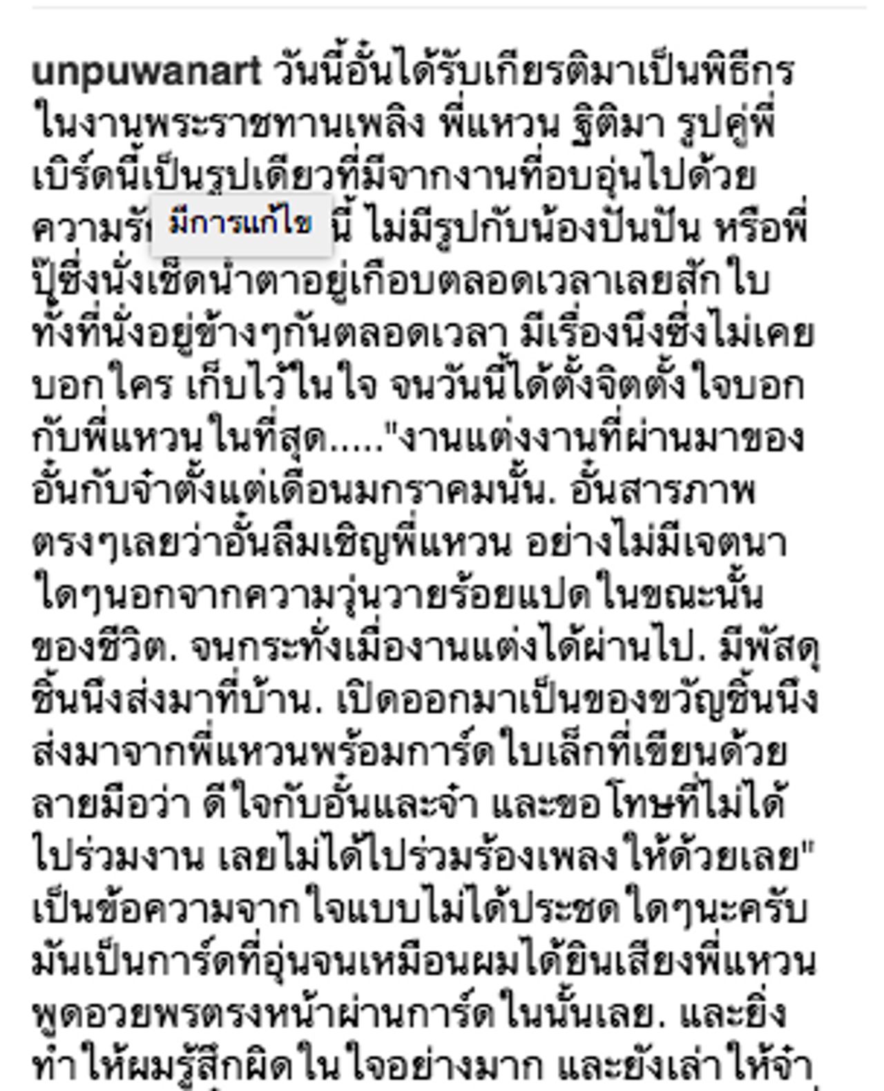 “วันนี้อั๋นได้รับเกียรติมาเป็นพิธีกรในงานพระราชทานเพลิง พี่แหวน ฐิติมา รูปคู่พี่เบิร์ดนี้เป็นรูปเดียวที่มีจากงานที่อบอุ่นไปด้วยความรักและคิดถึงนี้ ไม่มีรูปกับน้องปันปัน หรือพี่ปุ๊ซึ่งนั่งเช็ดน้ำตาอยู่เกือบตลอดเวลาเลยสักใบ ทั้งที่นั่งอยู่ข้างๆ กันตลอดเวลา