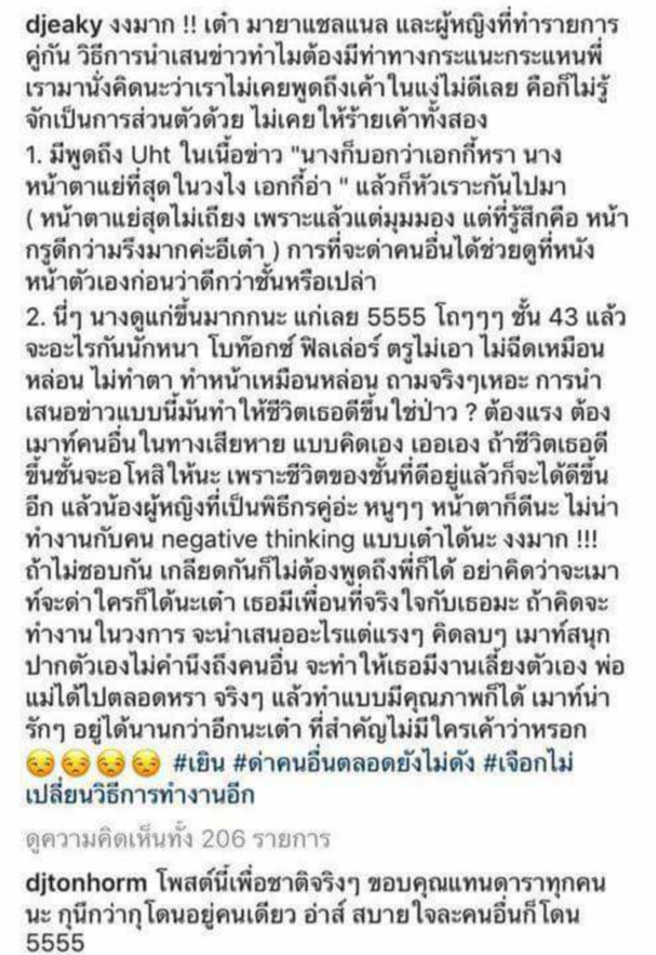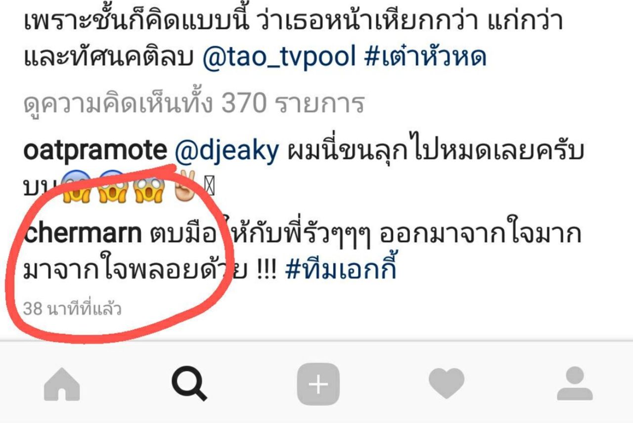 ซึ่งหลังจากที่ ดีเจเอกกี้ โพสต์ก็มีดารามาร่วมแสดงความคิดเห็นจำนวนมาก ทั้ง พลอย เฌอมาลย์, ดีเจบุ๊คโกะ, อ้น ศรีพรรณ, โอ๊ต ปราโมทย์, ดีเจต้นหอม เชียร์ดีเจเอกกี้ #ทีมเอกกี้ กันเพียบ.