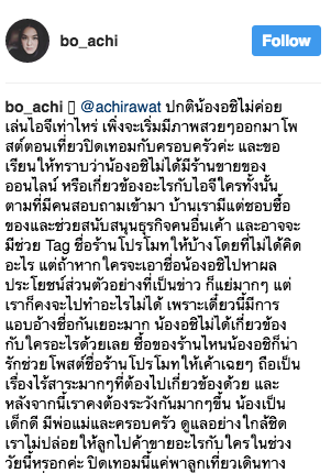 "@achirawat ปกติน้องอชิไม่ค่อยเล่นไอจีเท่าไหร่ เพิ่งจะเริ่มมีภาพสวยๆ ออกมาโพสต์ตอนเที่ยวปิดเทอมกับครอบครัวค่ะ และขอเรียนให้ทราบว่าน้องอชิไม่ได้มีร้านขายของออนไลน์ หรือเกี่ยวข้องอะไรกับไอจีใครทั้งนั้นตามที่มีคนสอบถามเข้ามา บ้านเรามีแต่ชอบซื้อของและช่วยสนับสนุนธุรกิจคนอื่นเค้า และอาจจะมีช่วย Tag ชื่อร้านโปรโมตให้บ้างโดยที่ไม่ได้คิดอะไร