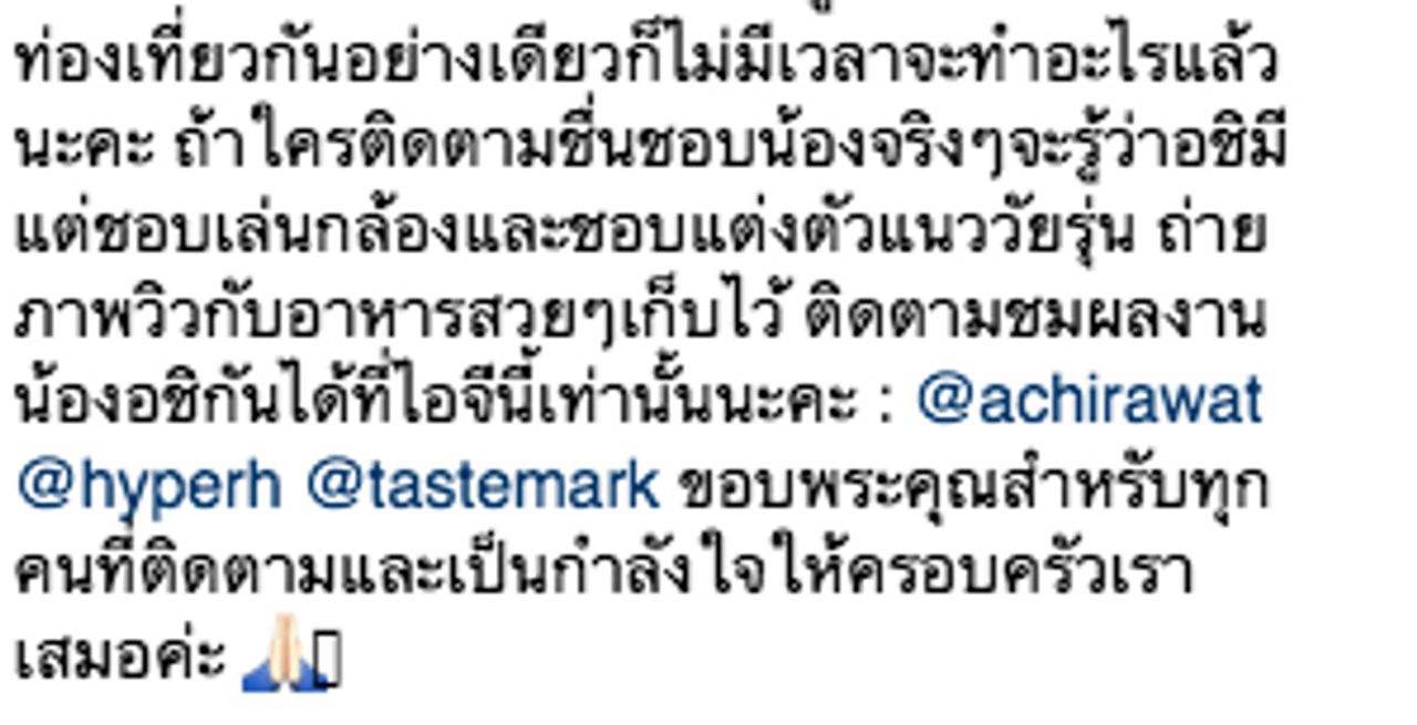 ถ้าใครติดตามชื่นชอบน้องจริงๆ จะรู้ว่าอชิมีแต่ชอบเล่นกล้องและชอบแต่งตัวแนววัยรุ่น ถ่ายภาพวิวกับอาหารสวยๆ เก็บไว้ ติดตามชมผลงานน้องอชิกันได้ที่ไอจีนี้เท่านั้นนะคะ : @achirawat @hyperh @tastemark ขอบพระคุณสำหรับทุกคนที่ติดตามและเป็นกำลังใจให้ครอบครัวเราเสมอค่ะ".