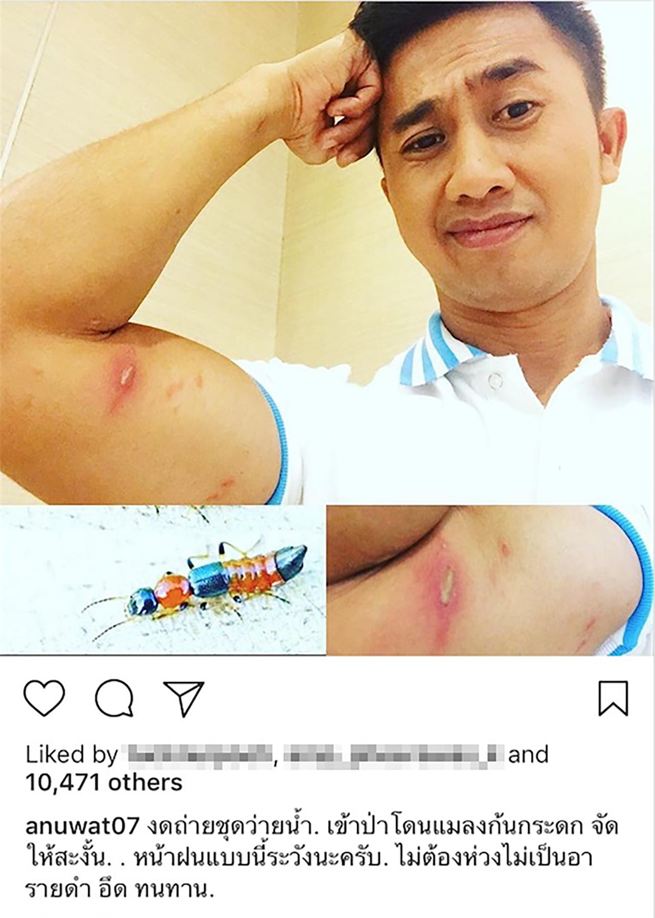 หนุ่ม อนุวัต เฟื่องทองแดง ผู้ประกาศข่าวช่อง 7 สี ที่หลายๆ คนคุ้นหน้าคุ้นตาและชื่นชอบในลีลาการอ่านข่าวของผู้ประกาศข่าวคนนี้ไม่น้อย แต่ล่าสุด เจ้าตัวเจอพิษแมลงก้นกระดกเล่นงานที่ต้นแขนด้านขวา เป็นแผลพุพองน่ากลัว หลังจากไปเข้าป่ามา พร้อมเตือนภัยให้แฟนๆ ระวังตัว