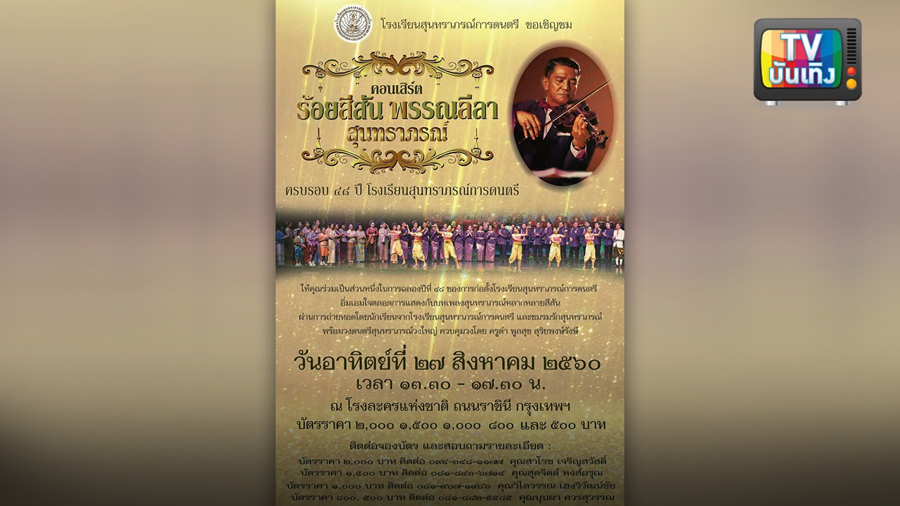 นั่นคือการแสดงคอนเสิร์ต “ร้อยสีสัน พรรณลีลา สุนทราภรณ์” โดยวงดนตรีสุนทราภรณ์วงใหญ่ ควบคุมวงโดย ครูดำพูลสุข สุริยพงษ์รังษี จะจัดขึ้นที่โรงละครแห่งชาติ วันอาทิตย์ที่ 27 สิงหาคมนี้ เวลา 13.30–17.30 น. เพียงรอบเดียวเท่านั้น