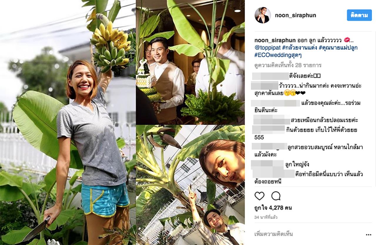 โดยเจ้าตัวได้โพสต์รูปตั้งแต่ในวันงานแต่ง จนกระทั้งต้นกล้วยออกปลี และตอนนี้ก็ออกเป็นลูกสุกไปครึ่งเครือแล้ว โดยสาวนุ่นบอกว่า ต้นกล้วยที่ใช้ในงานแต่งได้ออกลุกแล้ว โดนคนปลูกให้คือคุณแม่นั่นเอง