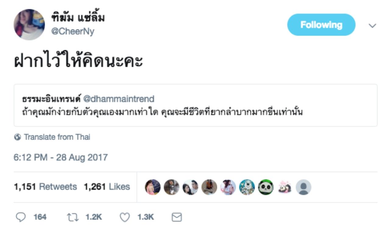 นอกจากนี้ก่อนที่เจ้าตัวจะทวีตข้อความดังกล่าว สาวเชียร์ก็ได้รีทวีตข้อความจากทวิตเตอร์ธรรมะอินเทรนด์ @dhammaintrend ที่ว่า “ถ้าคุณมักง่ายกับตัวคุณเองมากเท่าใด คุณจะมีชีวิตที่ยากลำบากมากขึ้นเท่านั้น” และโพสต์ข้อความว่า “ฝากไว้ให้คิดนะคะ”