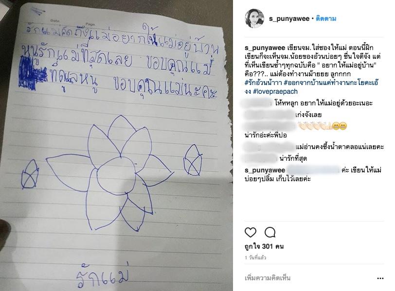 แต่ล่าสุด ปอ ปุณยวีร์ ได้เปิดข้อความของน้องแพรพัชร์ ที่ตอนนี้อายุ 6 ขวบ กำลังหัดเขียนหนังสือ และชอบเขียนจดหมายถึงแม่ปออยู่เสมอๆ ซึ่งพิธีกร-ผู้ประกาศสาวได้อวดจดหมายที่ลูกสาวตัวน้อยตั้งใจเขียนให้ผ่านอินสตาแกรมว่า