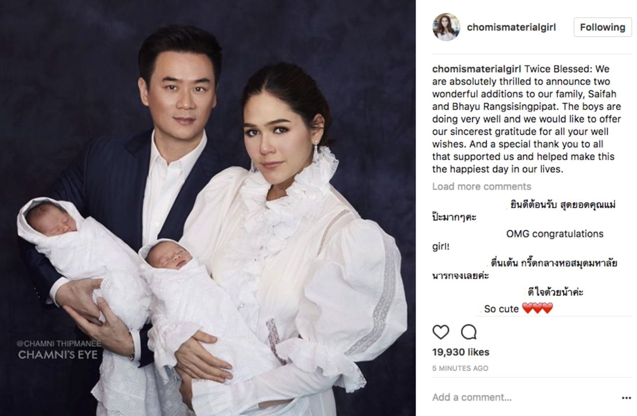 พร้อมเผยข้อความ "Twice Blessed: We are absolutely thrilled to announce two wonderful additions to our family, Saifah and Bhayu Rangsisingpipat. The boys are doing very well and we would like to offer our sincerest gratitude for all your well wishes. And a special thank you to all that supported us and helped make this the happiest day in our lives (พวกเรารู้สึกตื่นเต้นมากที่จะได้เปิดเผยสมาชิกครอบครัวของเราอีก 2 คน คือ สายฟ้า และ พายุ รังษีสิงห์พิพัฒน์ เด็กทั้งสองคนมีสุขภาพแข็งแรง และเราอยากขอแสดงความขอบคุณอย่างจริงใจสำหรับทุกคำอวยพร และขอขอบคุณเป็นพิเศษสำหรับทุกคนที่สนับสนุนเรา และช่วยให้วันที่มีความสุขที่สุดในชีวิตของเราวันนี้เกิดขึ้น)"