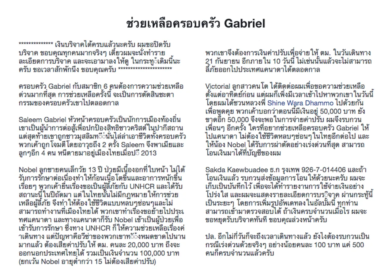 พวกเค้าบอกว่าตอนนี้มีเงินอยู่ 50,000 บาท ยังขาดอีก 50,000 จึงจะพอในการจ่ายค่าปรับ ผมจึงรบกวนเพื่อนๆ อีกครั้ง ใครที่อยากช่วยเหลือครอบครัว Gabriel ให้ไปแคนาดา ไม่ต้องใช้ชีวิตหลบๆ ซ่อนๆ ในไทยอีกต่อไป และให้น้อง Nobel ได้รับการผ่าตัดอย่างเร่งด่วนที่สุด สามารถโอนเงินมาได้ที่บัญชีของผม
