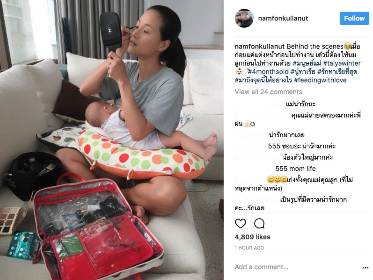 ล่าสุดแม่น้ำฝนได้โพสต์ภาพลงอินสตาแกรม ที่ดูแล้วทำให้รู้สึกว่าอบอุ่นมากๆ แม้จะเป็นแม่ลูกอ่อน แต่ก็ยังไงความสวยก็ต้องมีอยู่เสมอ เมื่อแม่ก็ต้องแต่งหน้าก่อนออกไปทำงาน ส่วนลูกก็ต้องกินนม งานนี้แม่น้ำฝนเลยใช้วิธี นั่งแต่งหน้าไปด้วย และให้น้องทาเรียดูดนมจ๊วบๆ ไปด้วย เห็นแล้วรู้สึกอบอุ่นและมีความสุขยังไงบอกไม่ถูก งานนี้แฟนๆ ที่ติดตามต่างก็เข้ามาบอกว่า สาวน้ำฝนเป็นคุณแม่ที่มีความสตรองของแท้อยู่ในตัวจริงๆ...