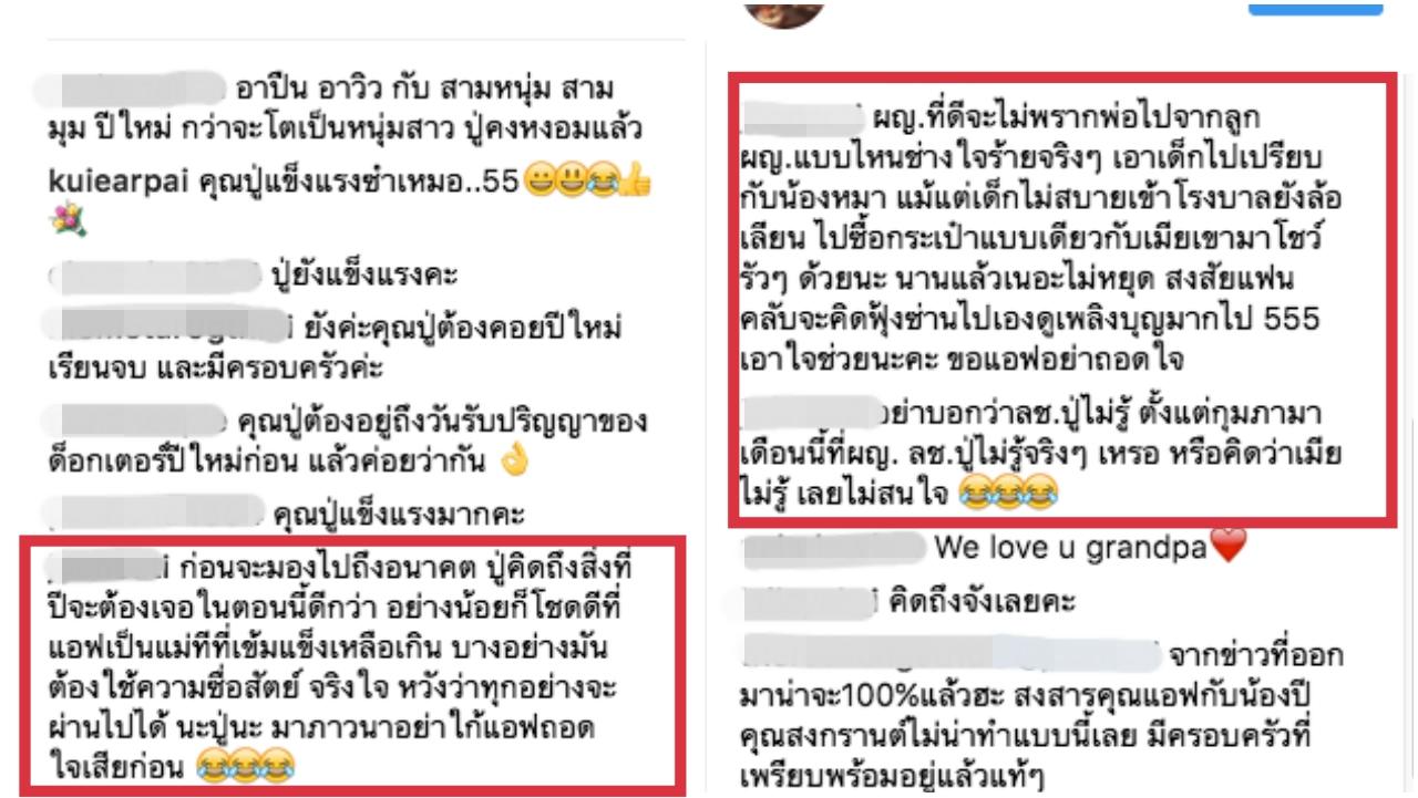 “ผู้หญิงที่ดี จะไม่พรากพ่อไปจากลูก ผู้หญิงแบบไหนช่างใจร้ายจริงๆ เอาเด็กไปเปรียบเทียบกับหมา แม้แต่เด็กไม่สบายเข้าโรงพยาบาลยังล้อเลียน ไปซื้อกระเป๋าแบบเดียวกับเมียเขามาโชว์รัวๆ ด้วยนะ นานแล้วเนอะไม่หยุด สงสัยแฟนคลับจะคิดฟุ้งซ่านไปเองดูเพลิงบุญมากไป 555 เอาใจช่วยนะคะ ขอแอฟอย่าถอดใจ”