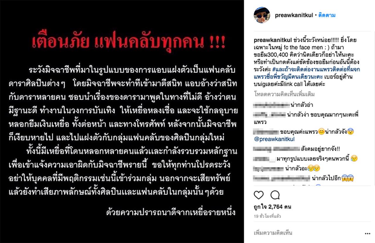 และสาวแพรวยังได้ลงแคปชั่นประกอบภาพข้อความดังกล่าวว่า “ช่วงนี้ระวังหน่อย!!!! ยิ่งโดยเฉพาะในหมู่ fc the face men :) ถ้ามาขอยืม 300, 400 คิดว่านิดเดียวก็อย่าให้นะคะ หรือทำเป็นกดตังค์แต่ขัดข้องขอยืมก่อนอันนี้ต้องระวังค่ะ #และถ้าจะติดต่องานแพรว ติดต่อที่ ผจก.ของแพรว ชื่อพี่ขวัญมีคนเดียวนะคะ เบอร์อยู่ด้านบน ig เลยค่ะ มี linl call ได้เลยค่ะ”.
