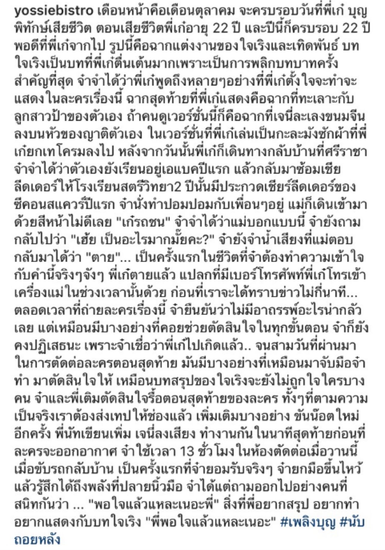 "เดือนหน้าคือเดือนตุลาคม จะครบรอบวันที่พี่เก๋ บุญพิทักษ์ เสียชีวิต ตอนเสียชีวิตพี่เก๋อายุ 22 ปี และปีนี้ก็ครบรอบ 22 ปีพอดีที่พี่เก๋จากไป รูปนี้คือฉากแต่งงานของใจเริงและเทิดพันธ์ บทใจเริงเป็นบทที่พี่เก๋ตื่นเต้นมาก เพราะเป็นการพลิกบทบาทครั้งสำคัญที่สุด จ๋าจำได้ว่าพี่เก๋พูดถึงหลายๆ อย่างที่พี่เก๋ตั้งใจจะทำ จะแสดงในละครเรื่องนี้