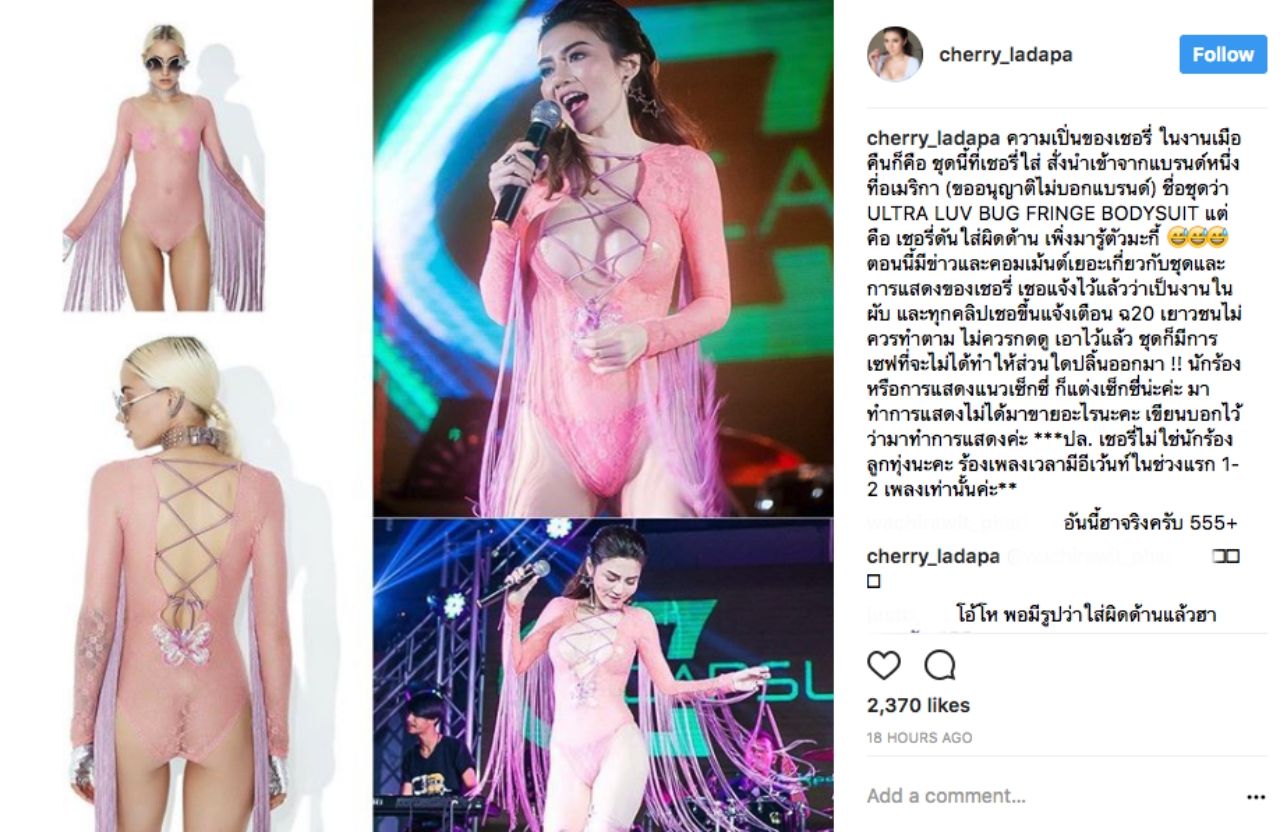 "ความเปิ่นของเชอรี่ ในงานเมื่อคืนก็คือ ชุดนี้ที่เชอรี่ใส่ สั่งนำเข้าจากแบรนด์หนึ่งที่อเมริกา (ขออนุญาตไม่บอกแบรนด์) ชื่อชุดว่า ULTRA LUV BUG FRINGE BODYSUIT แต่คือเชอรี่ดันใส่ผิดด้าน เพิ่งมารู้ตัวมะกี้ ตอนนี้มีข่าวและคอมเมนต์เยอะเกี่ยวกับชุดและการแสดงของเชอรี่