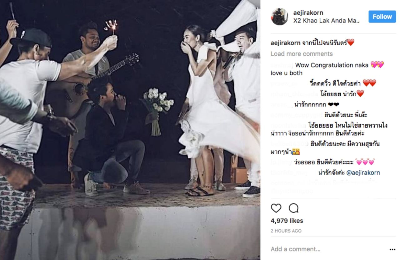 ด้าน เอ๊ะ ก็ได้ลงภาพกำลังคุกเข่าบอกรักชมพู่ และมอบดอกไม้ให้ในอินสตาแกรมส่วนตัว พร้อมด้วยแคปชั่น "จากนี้ไปจนนิรันดร์" นอกจากนี้เพื่อนๆ ของทั้งคู่ก็ได้ลงภาพบรรยากาศการขอแต่งงานระหว่างเอ๊ะและชมพู่ พร้อมด้วยข้อความแสดงความยินดีด้วย