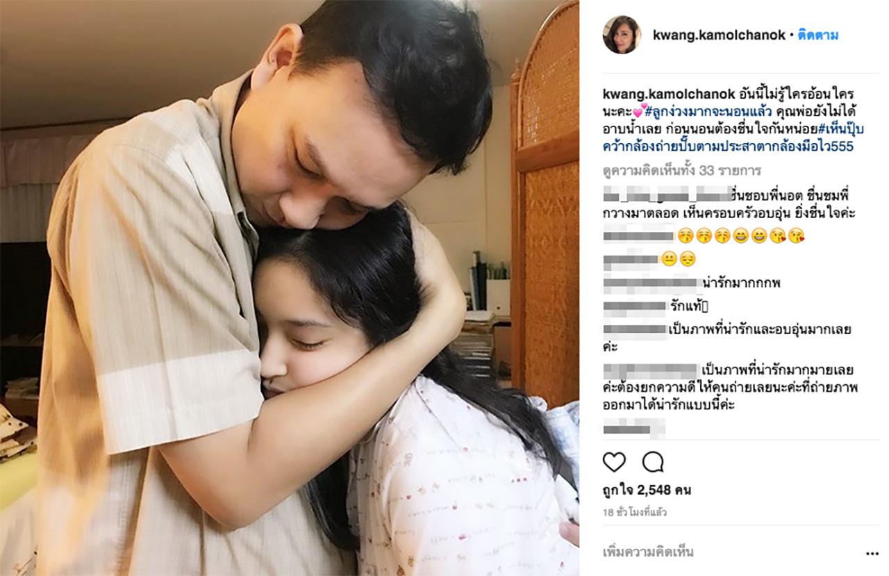 และล่าสุด ต้องอบอุ่นไปกับภาพนี้ เมื่อคุณพ่อน็อต เข้ามาโอบกอดลูกสาวน้องเนยก่อนนอน ด้วยความรัก โดยมีแม่กวางเป็นช่างภาพถ่ายรูปนี้เก็บเอาไว้เป็นที่ระลึก พร้อมแคปชั่นว่า “อันนี้ไม่รู้ใครอ้อนใครนะคะ #ลูกง่วงมากจะนอนแล้ว คุณพ่อยังไม่ได้อาบน้ำเลย ก่อนนอนต้องชื่นใจกันหน่อย #เห็นปุ๊บคว้ากล้องถ่ายปั๊บตามประสาตากล้องมือไว555”
